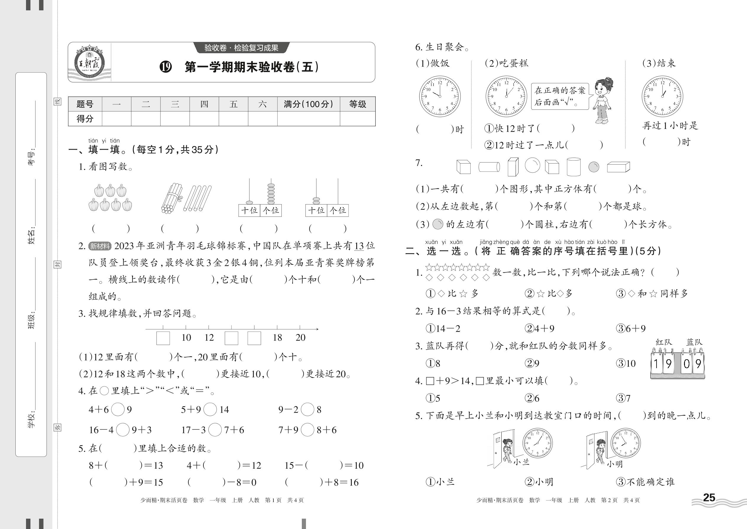 2023上册一年级数学人教版 19 第一学期期末验收卷(五)