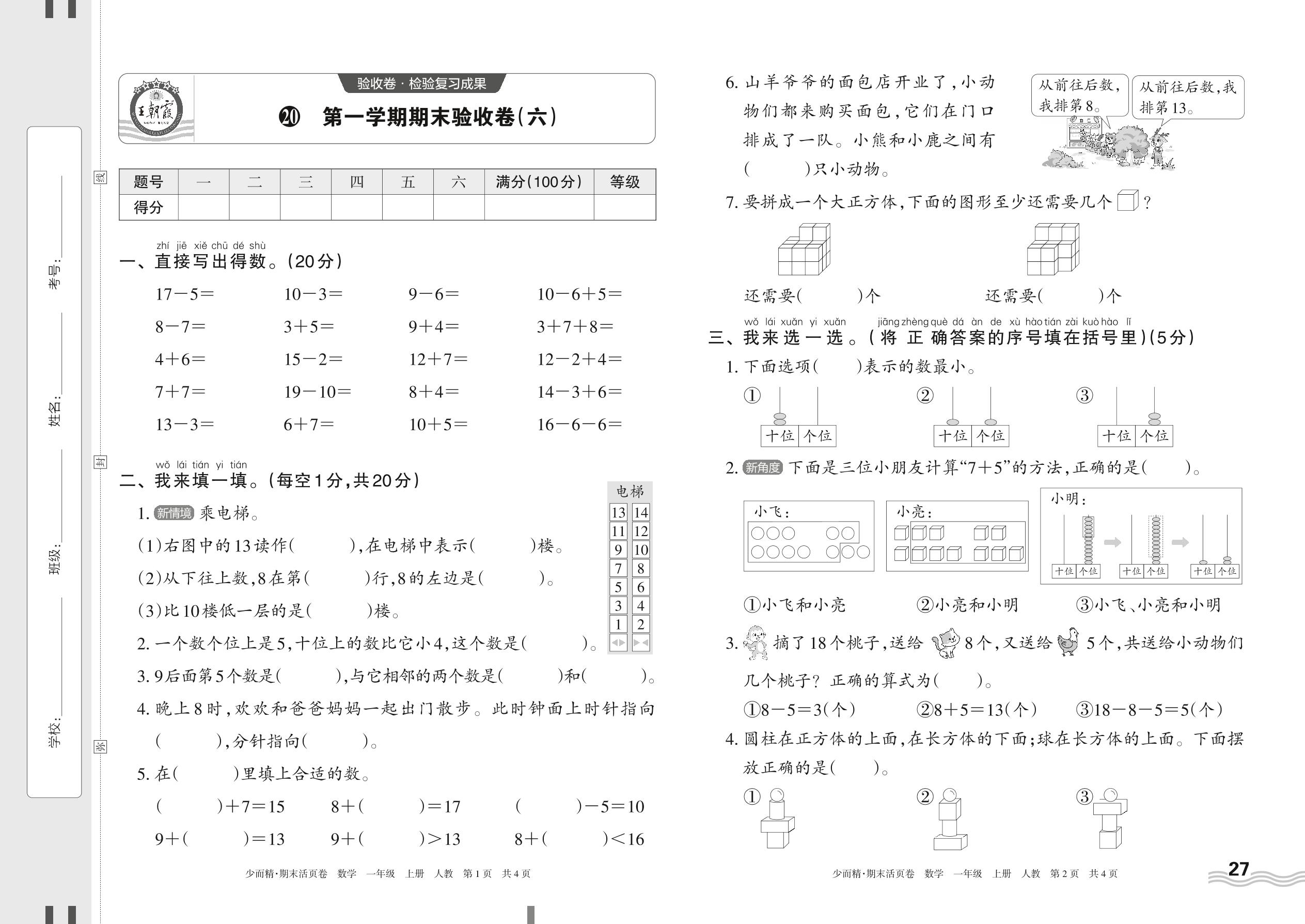 2023上册一年级数学人教版 20 第一学期期末验收卷(六)