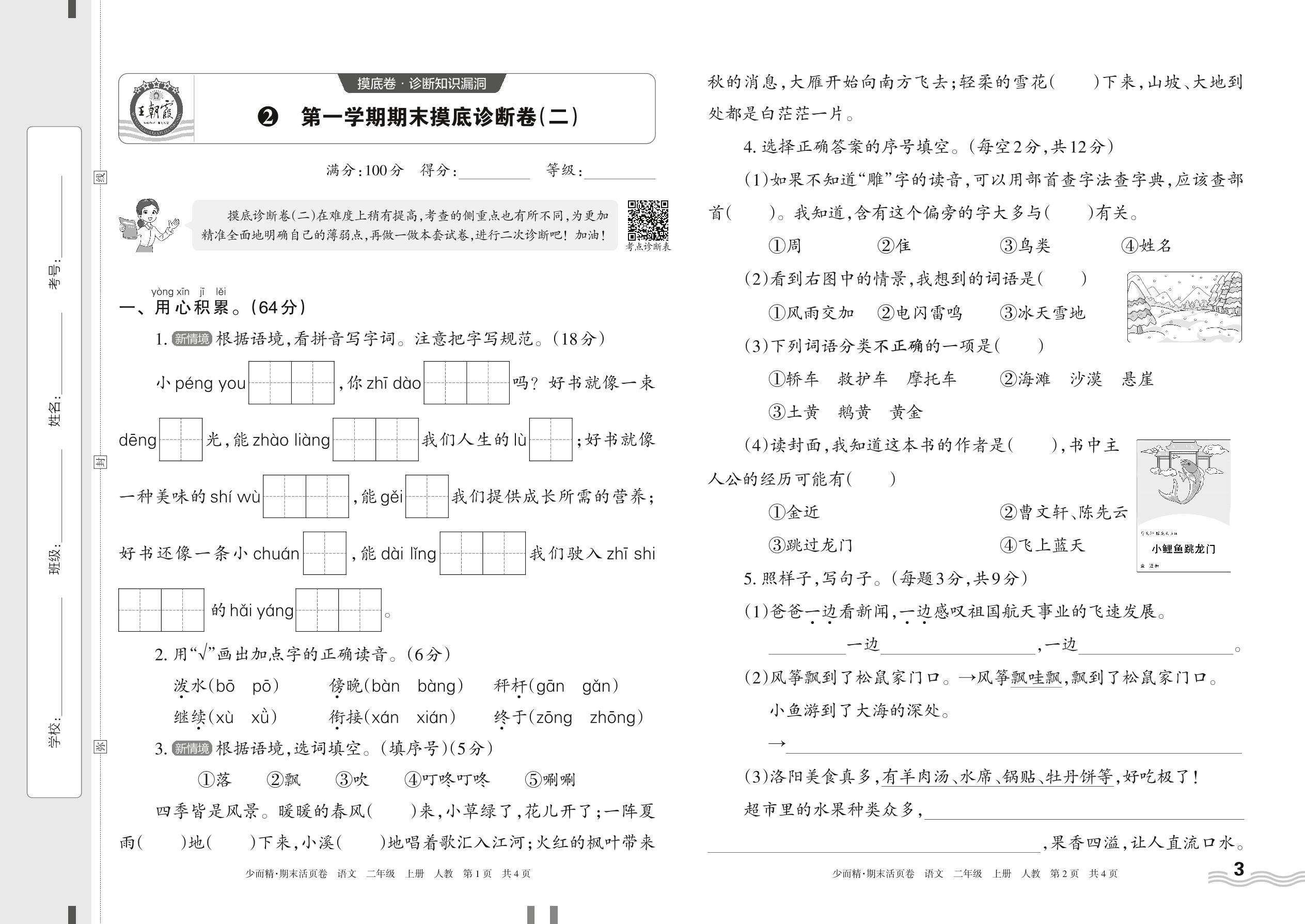 2023上册二年级语文人教版 2 第一学期期末摸底诊断卷(二)
