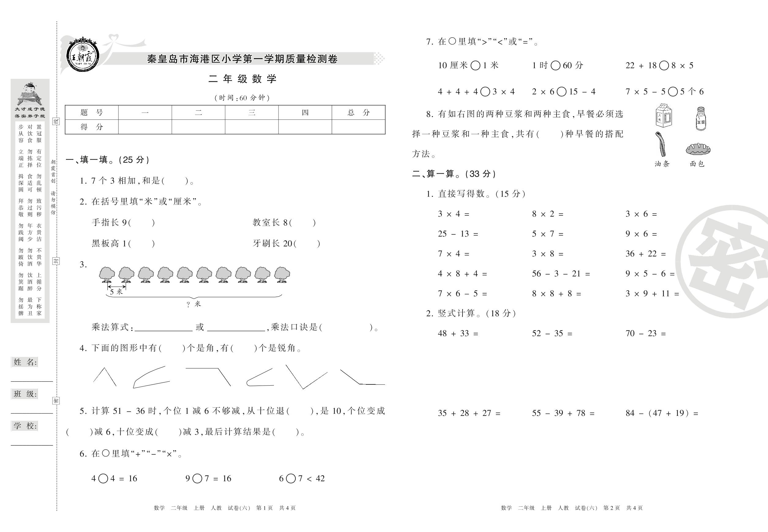 2016-2017学年第一学期秦皇岛市海港区二年级数学试卷(人教版)【6】