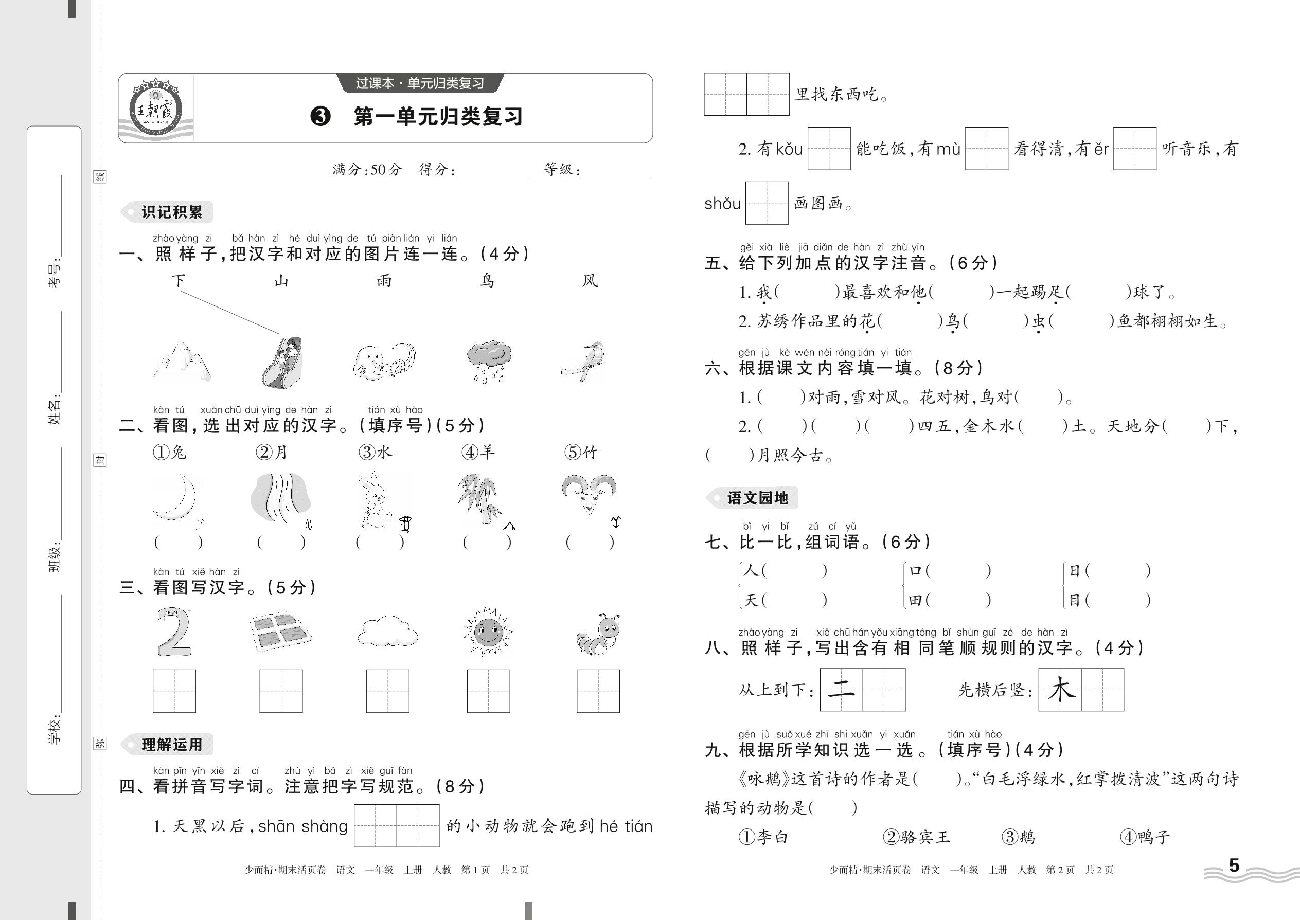 2023上册一年级语文人教版 3 第一单元归类复习