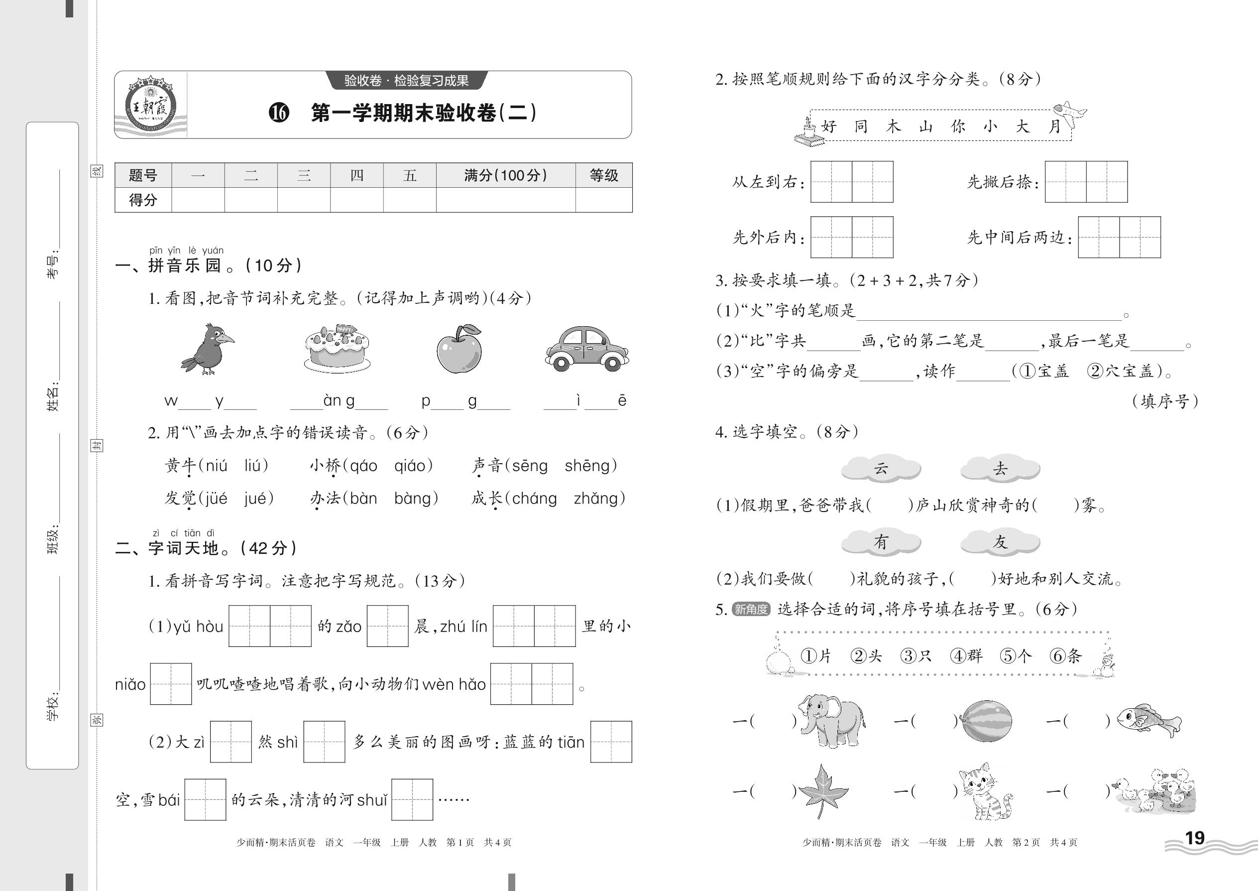 2023上册一年级语文人教版 16 第一学期期末验收卷(二)