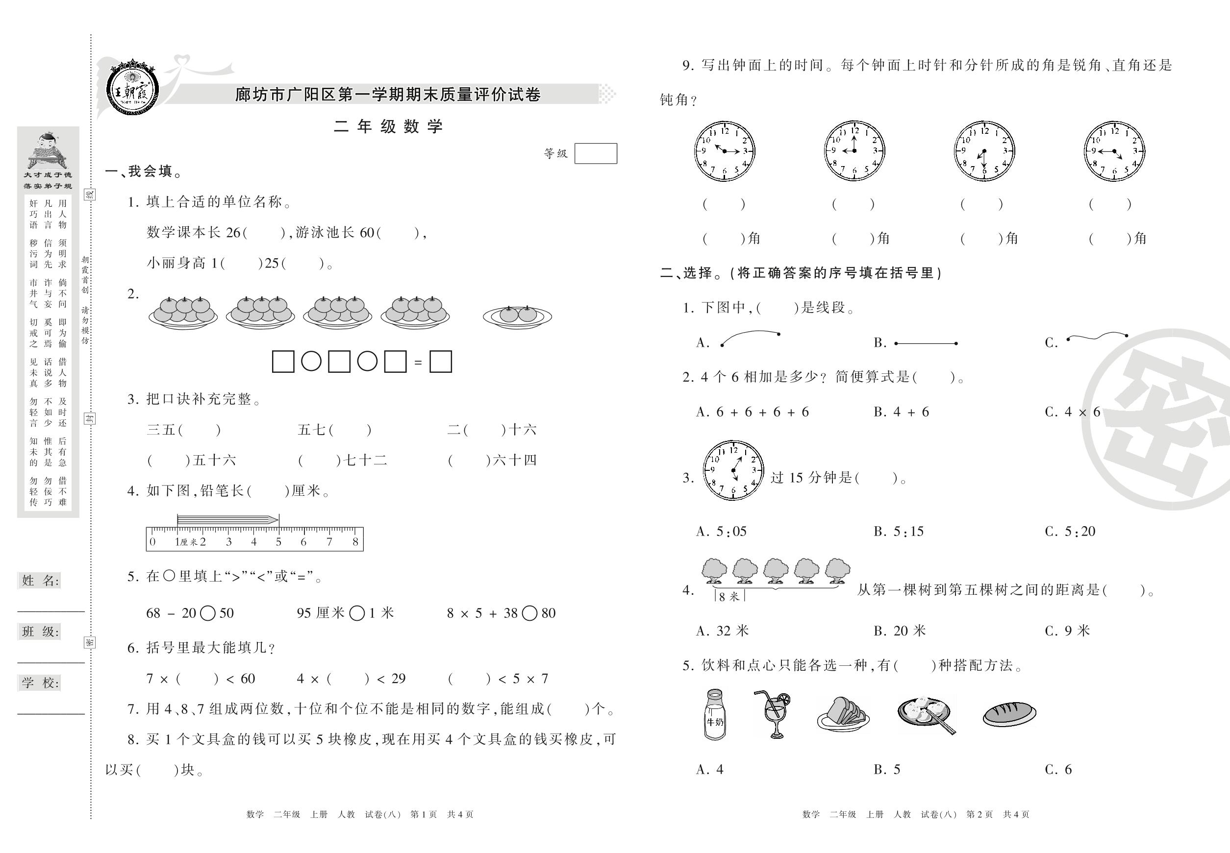 2016-2017学年第一学期廊坊市广阳区二年级数学试卷(人教版)【8】