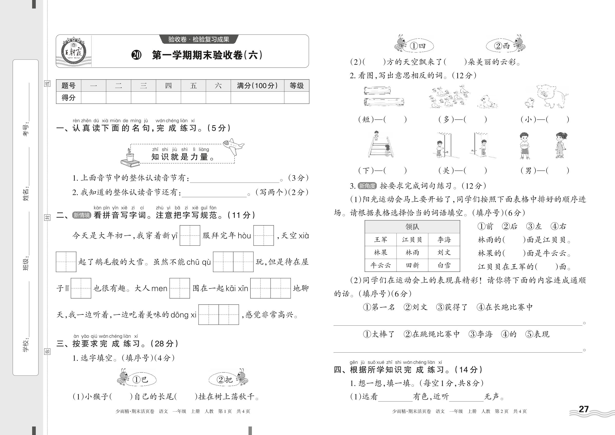 2023上册一年级语文人教版 20 第一学期期末验收卷(六)