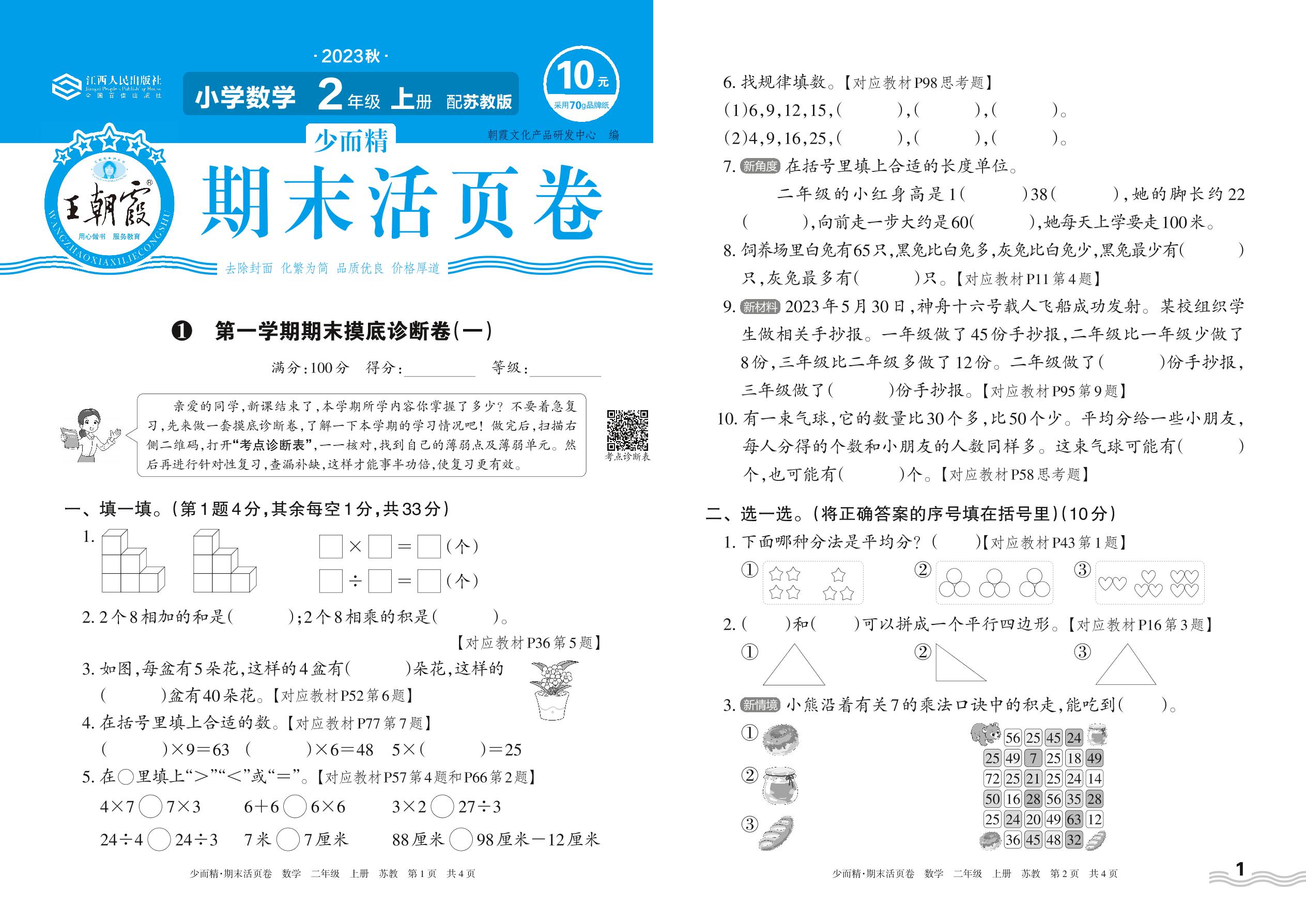 2023上册二年级数学苏教版 1 第一学期期末摸底诊断卷(一)