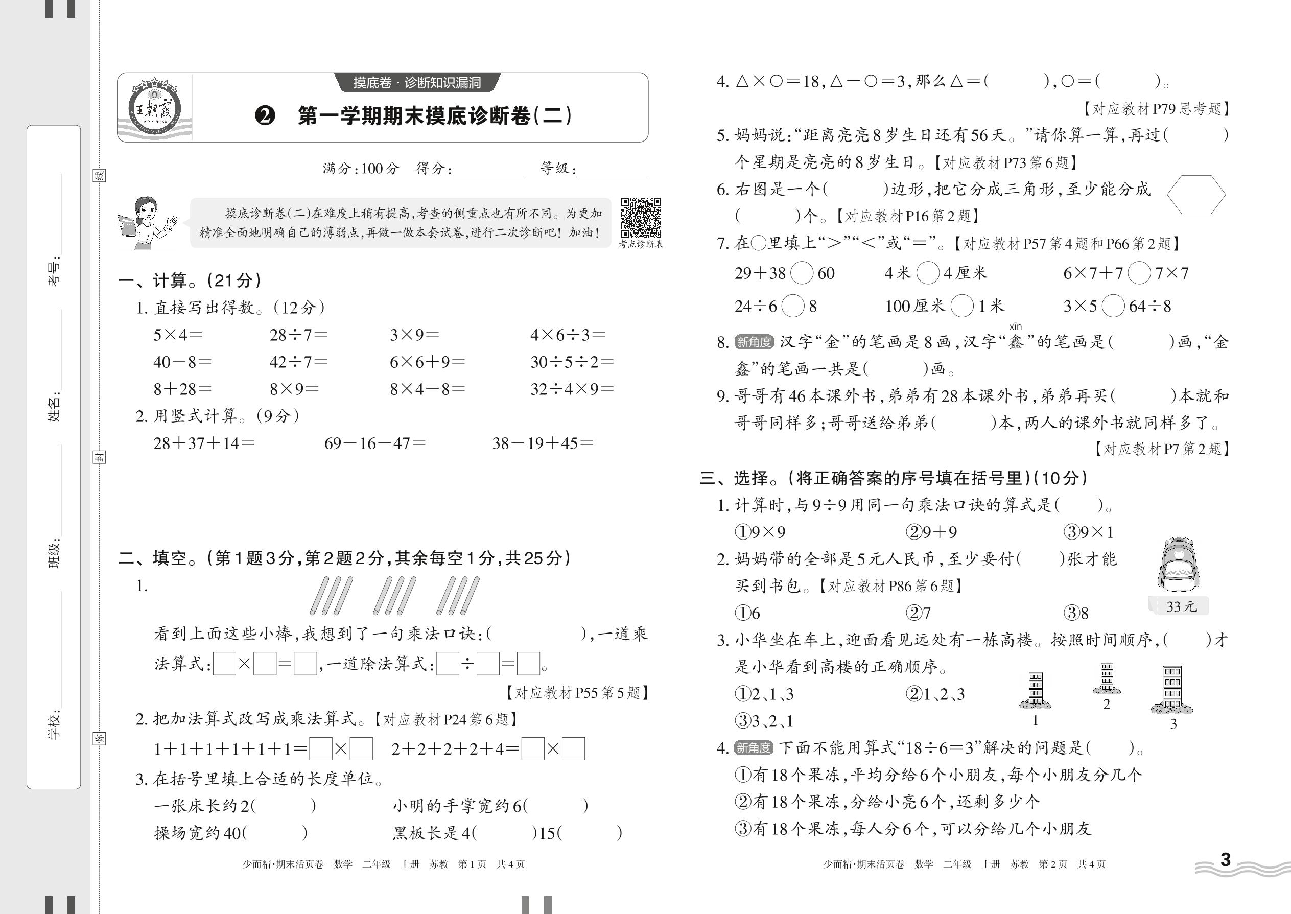 2023上册二年级数学苏教版 2 第一学期期末摸底诊断卷(二)