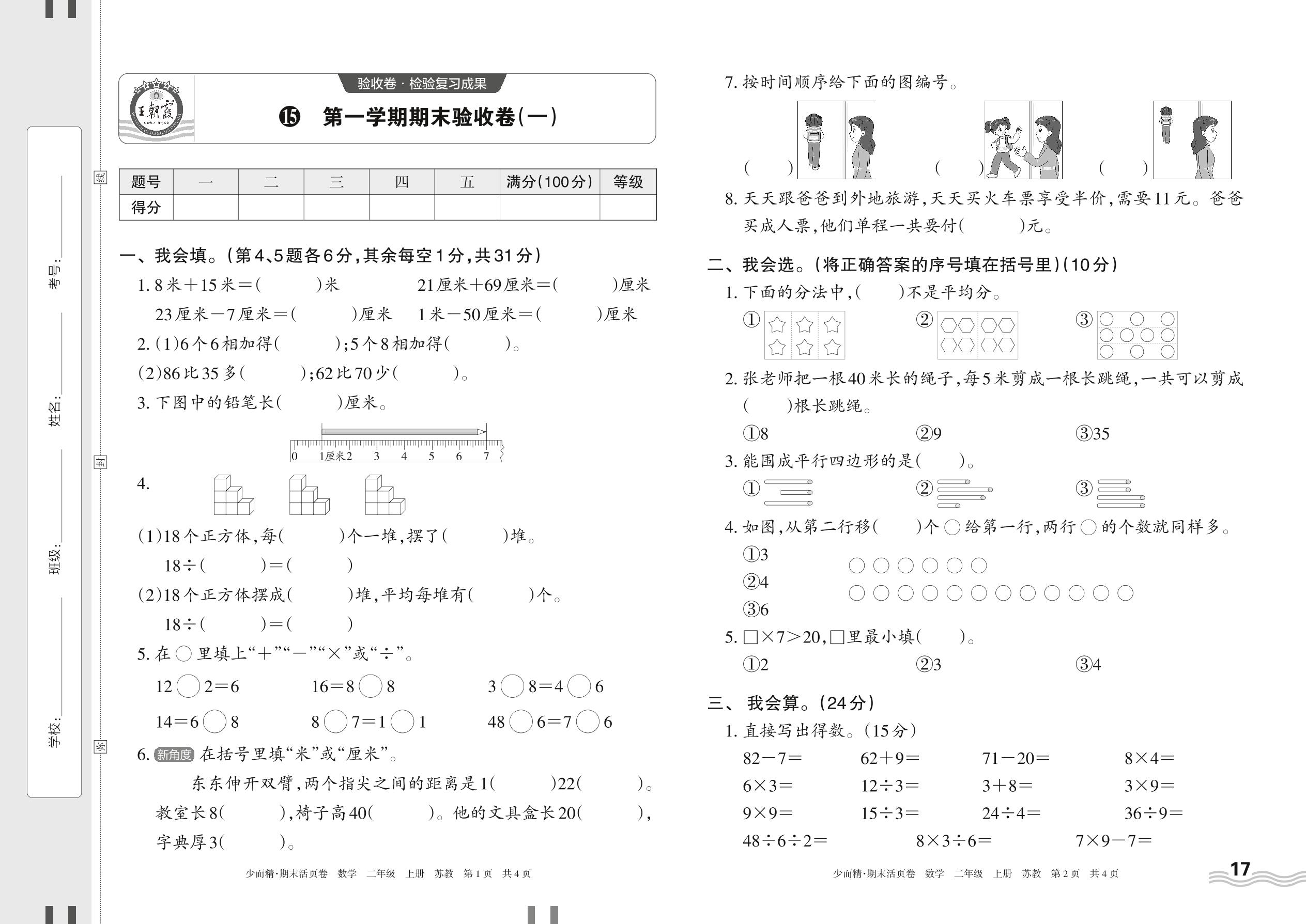 2023上册二年级数学苏教版 15 第一学期期末验收卷(一)