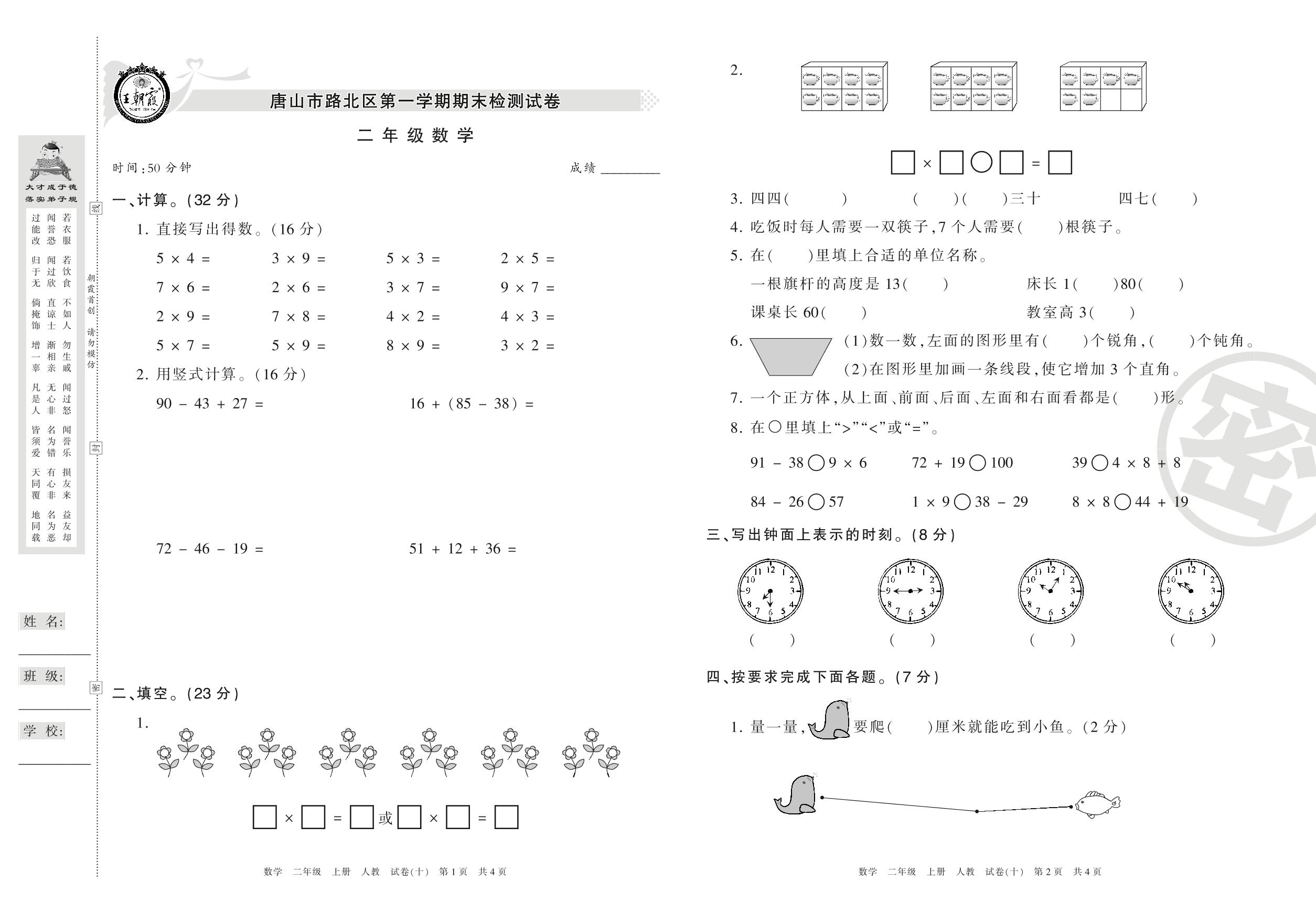 2016-2017学年第一学期唐山市路北区二年级数学试卷(人教版)【10】