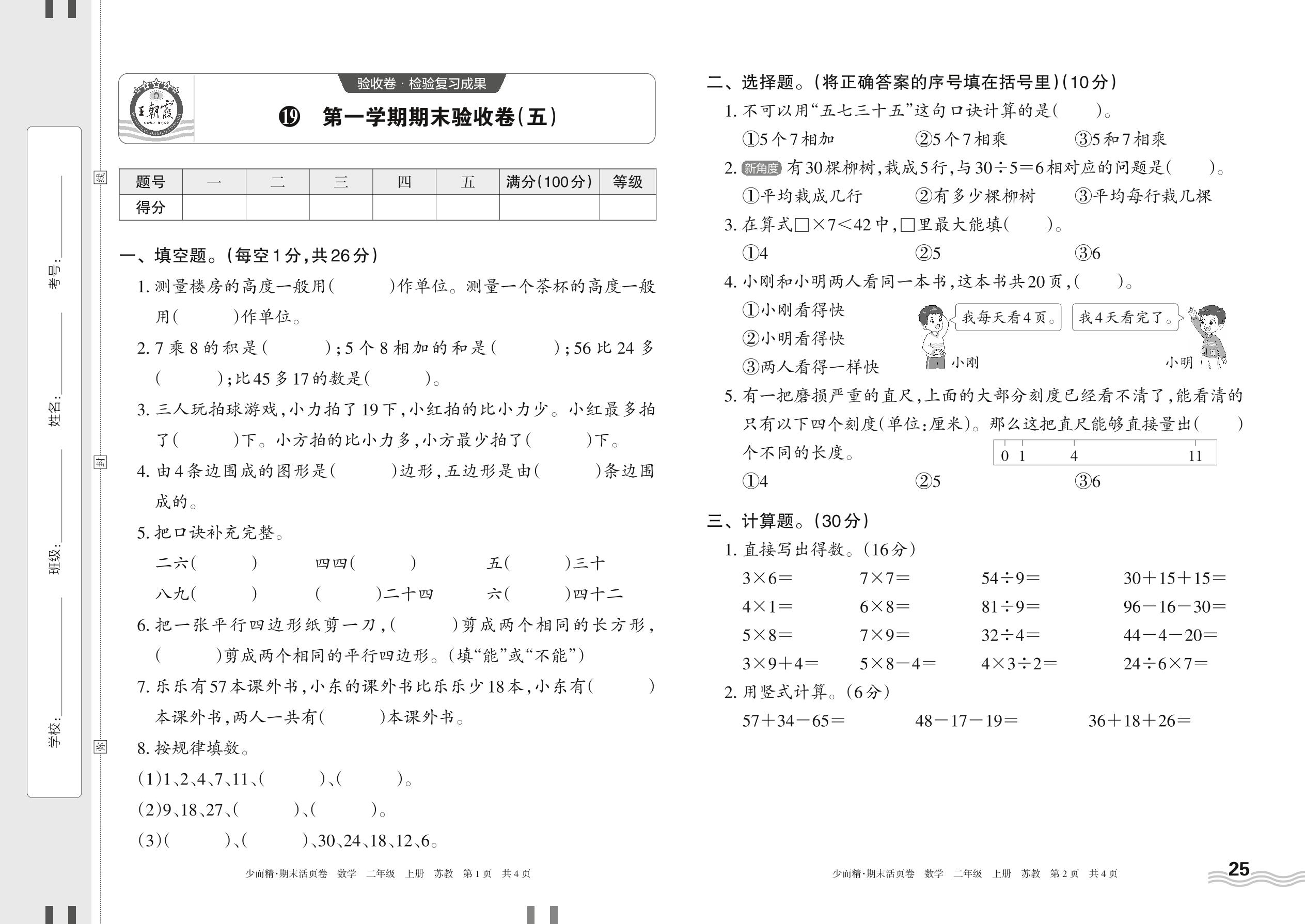 2023上册二年级数学苏教版 19 第一学期期末验收卷(五)