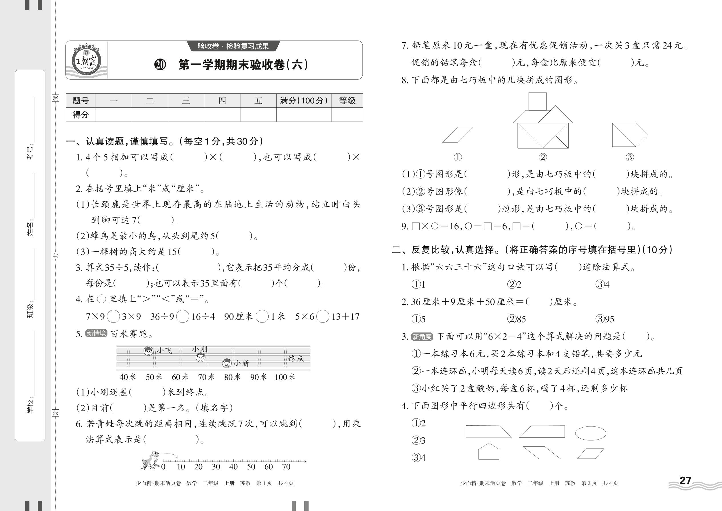 2023上册二年级数学苏教版 20 第一学期期末验收卷(六)