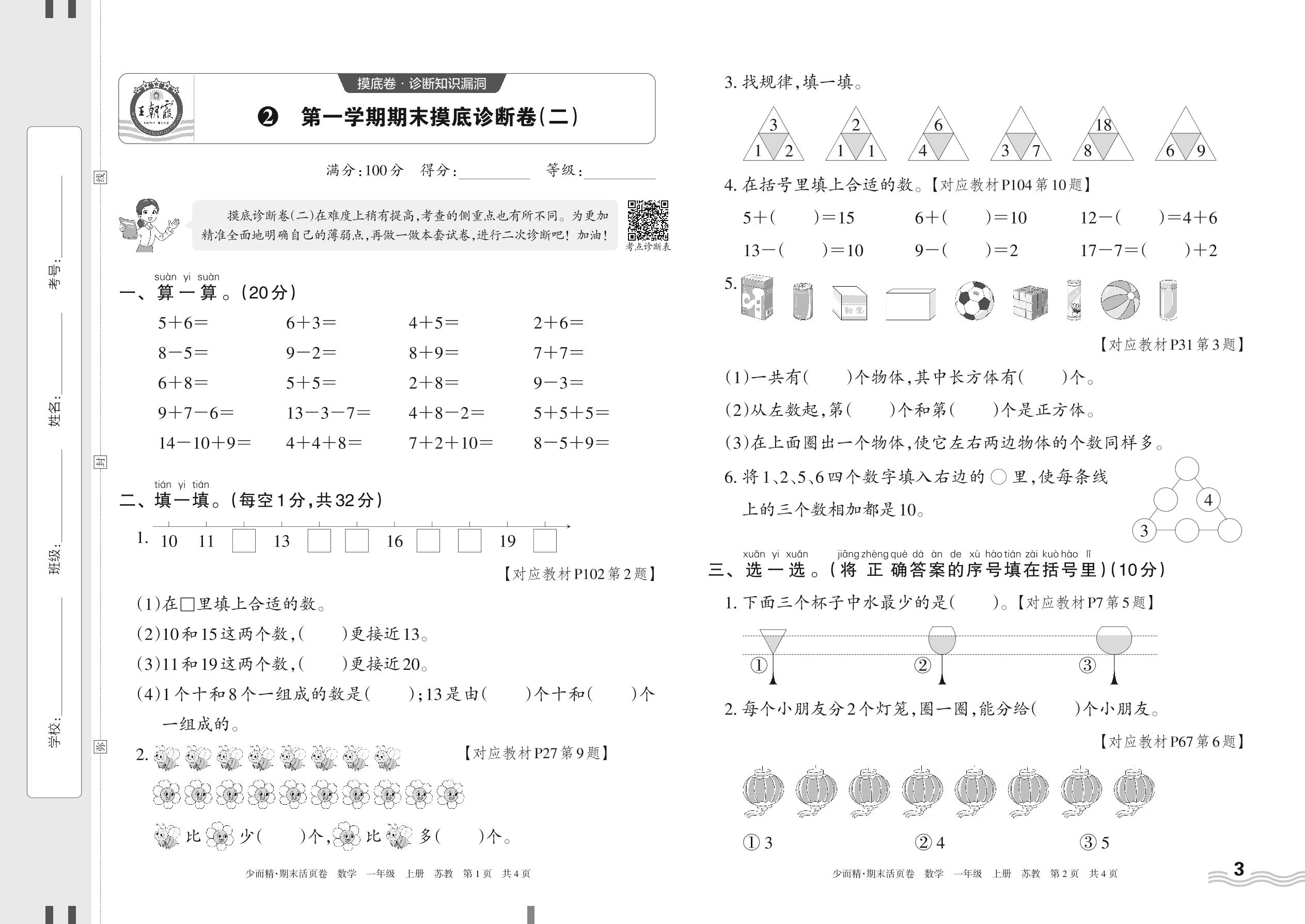 2023上册一年级数学苏教版 第一学期期末摸底诊断卷(二)