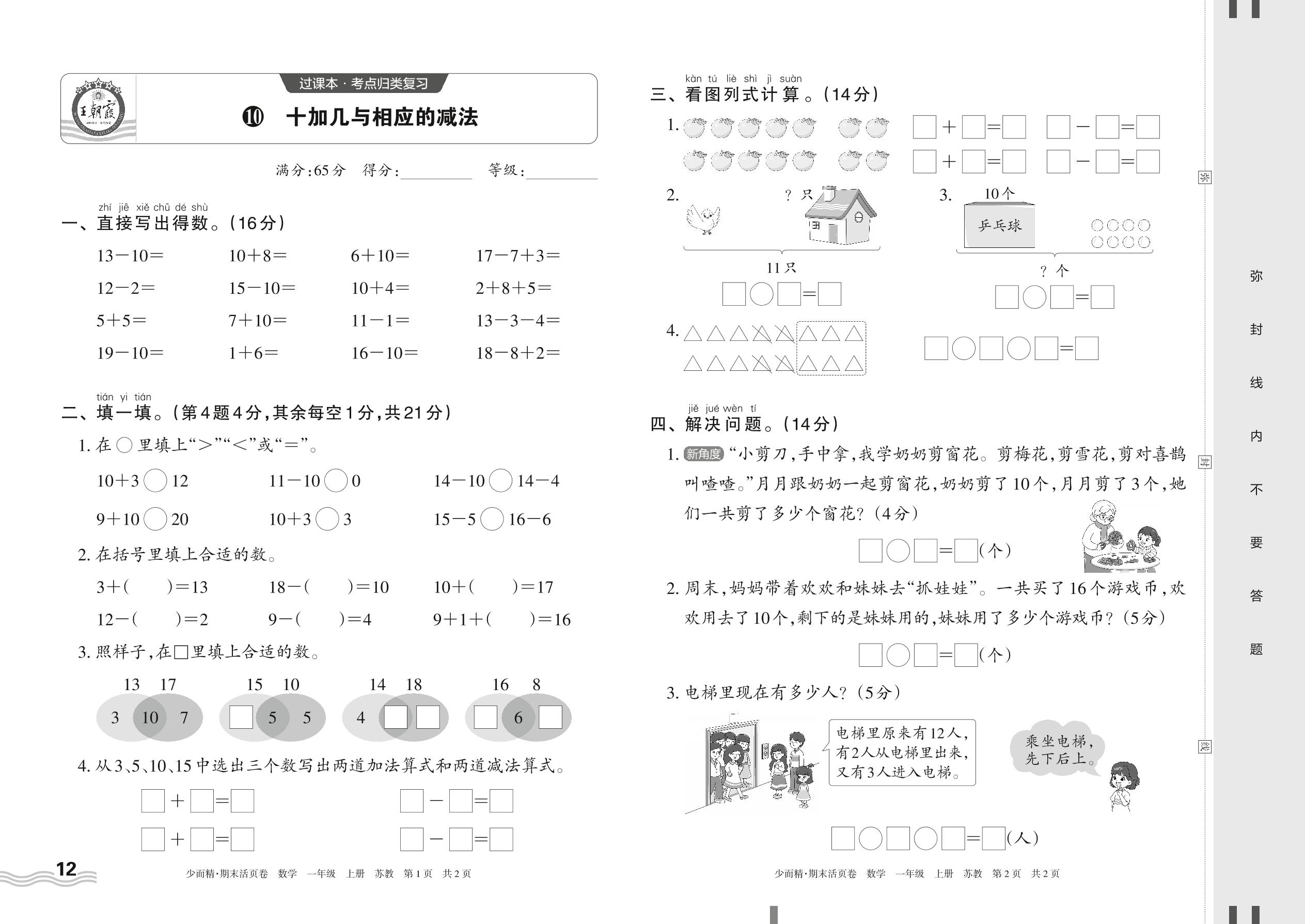 2023上册一年级数学苏教版 10 十加几与相应的减法