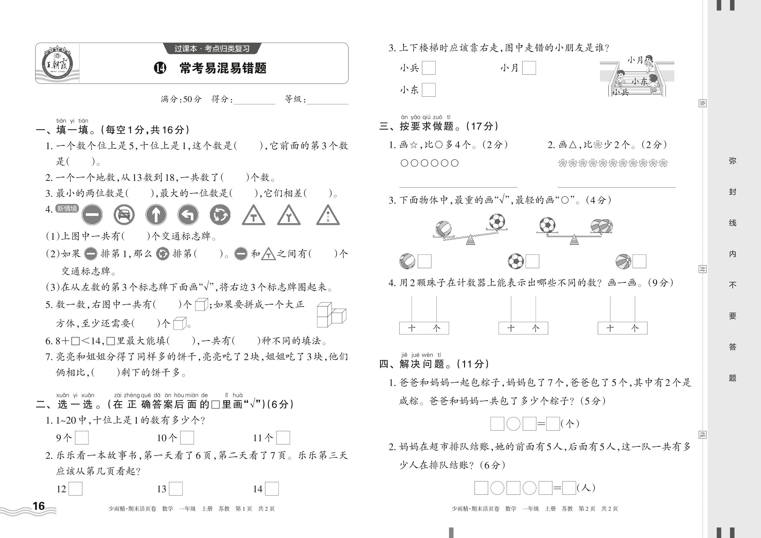 2023上册一年级数学苏教版 14 常考易混易错题