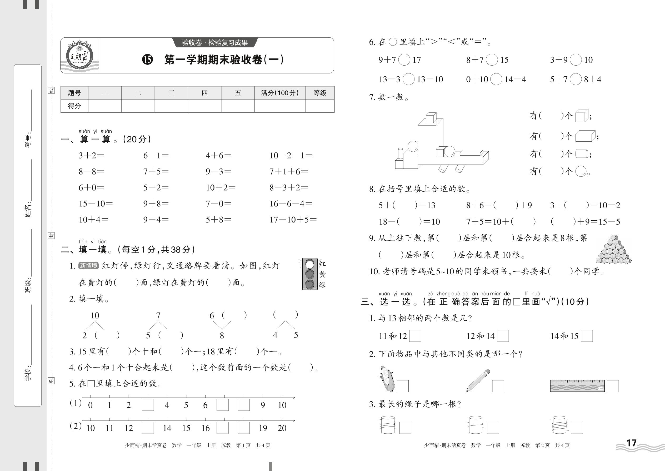 2023上册一年级数学苏教版 15 第一学期期末验收卷(一)