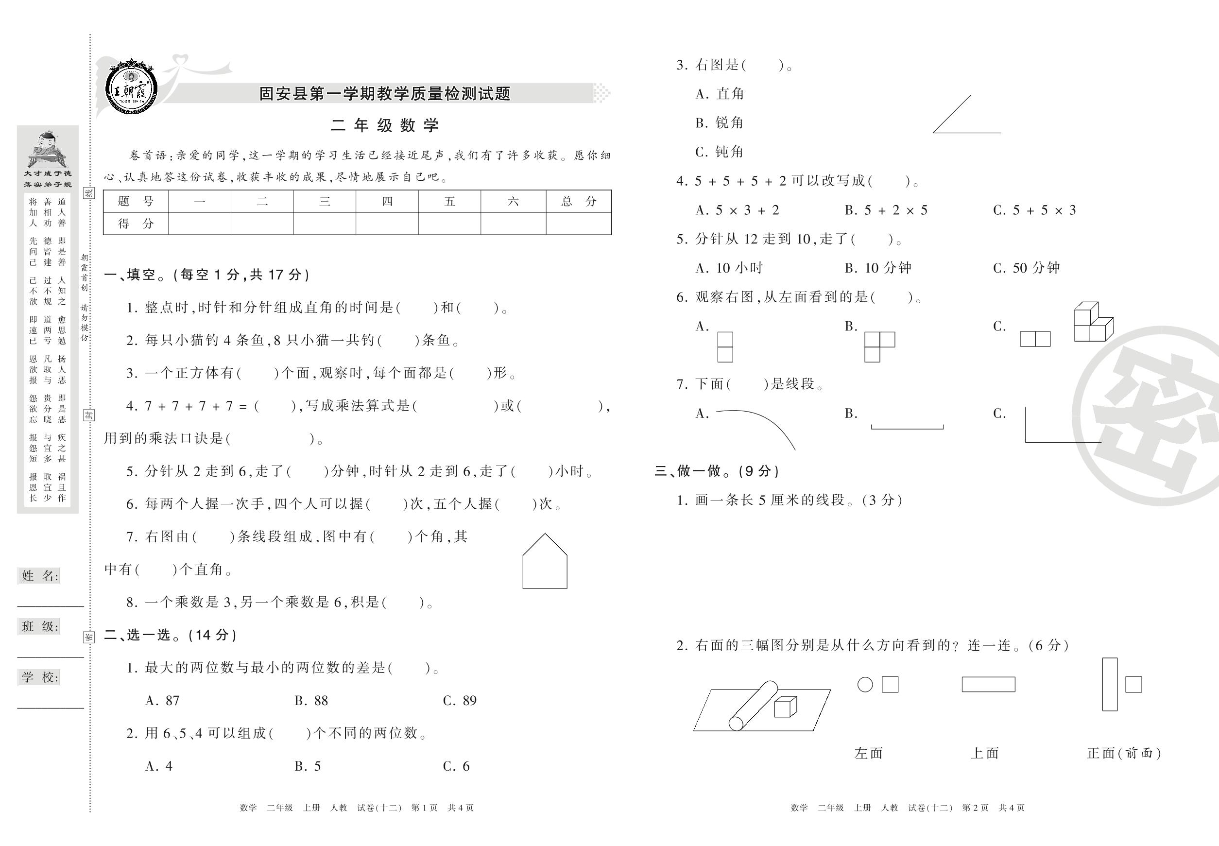 2016-2017学年第一学期廊坊市固安县二年级数学试卷(人教版)【12】