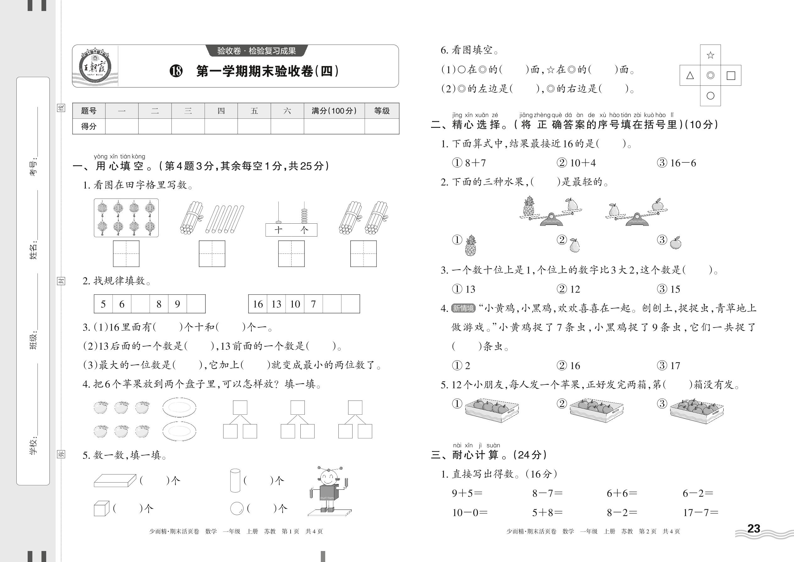 2023上册一年级数学苏教版 18 第一学期期末验收卷(四)