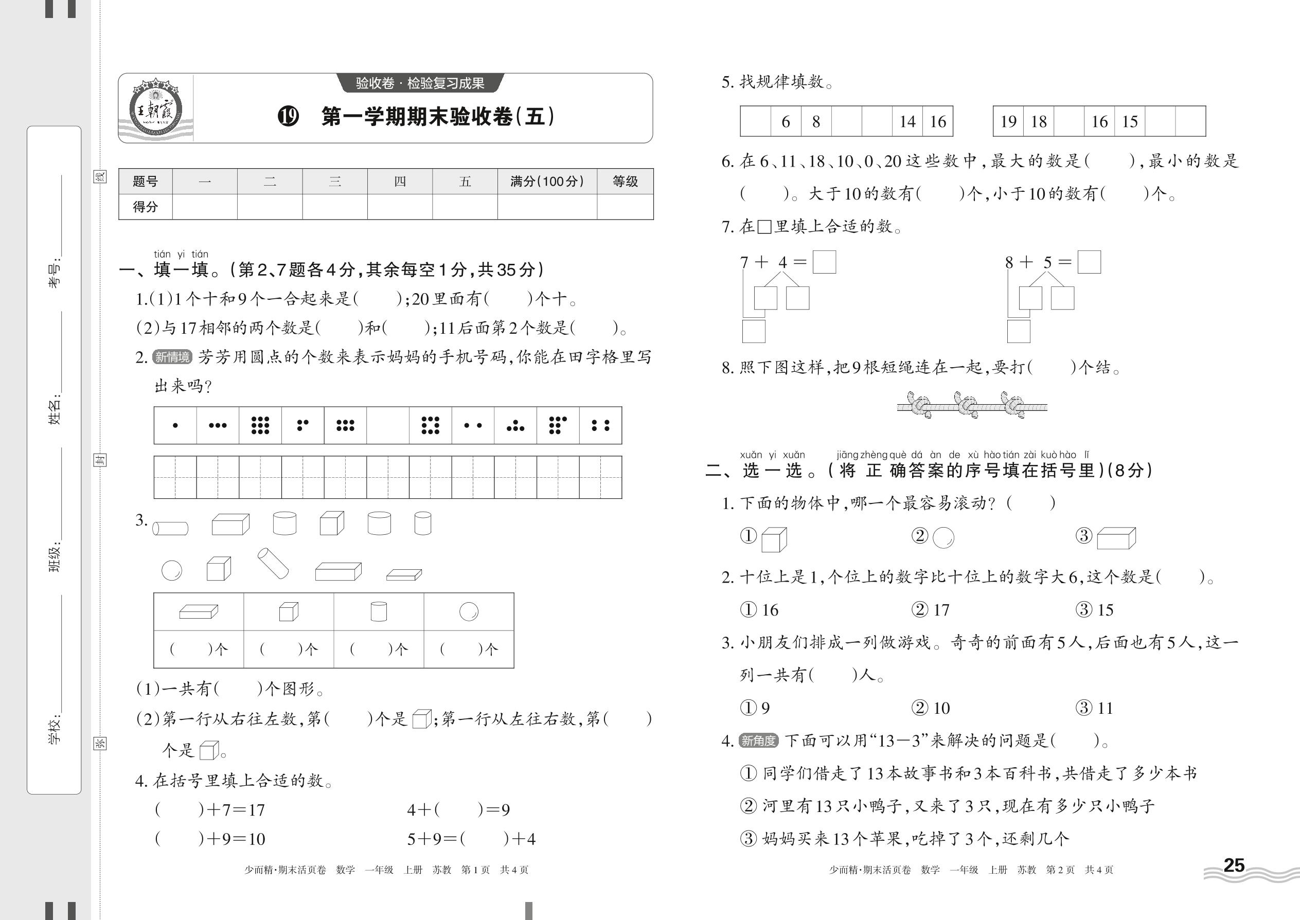 2023上册一年级数学苏教版 19 第一学期期末验收卷(五)