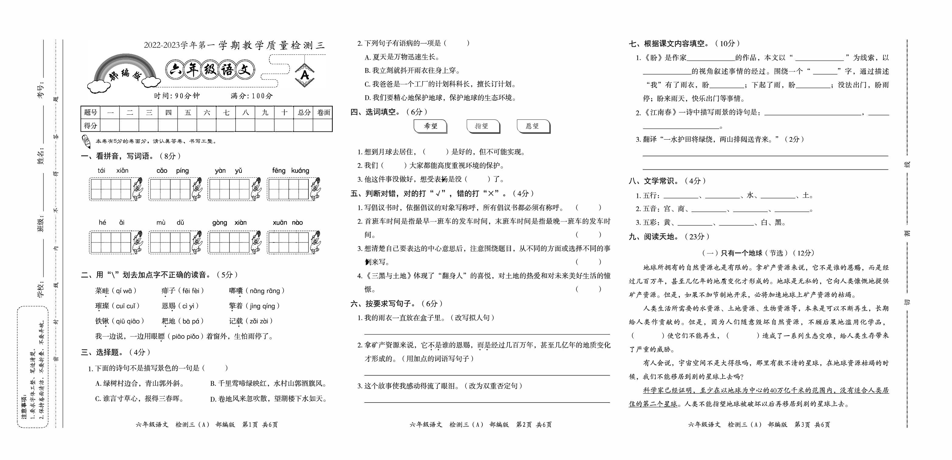 河北省邯郸市广平县明德小学2022-2023学年第一学期教学质量检测(三)六年级语文(人教版)