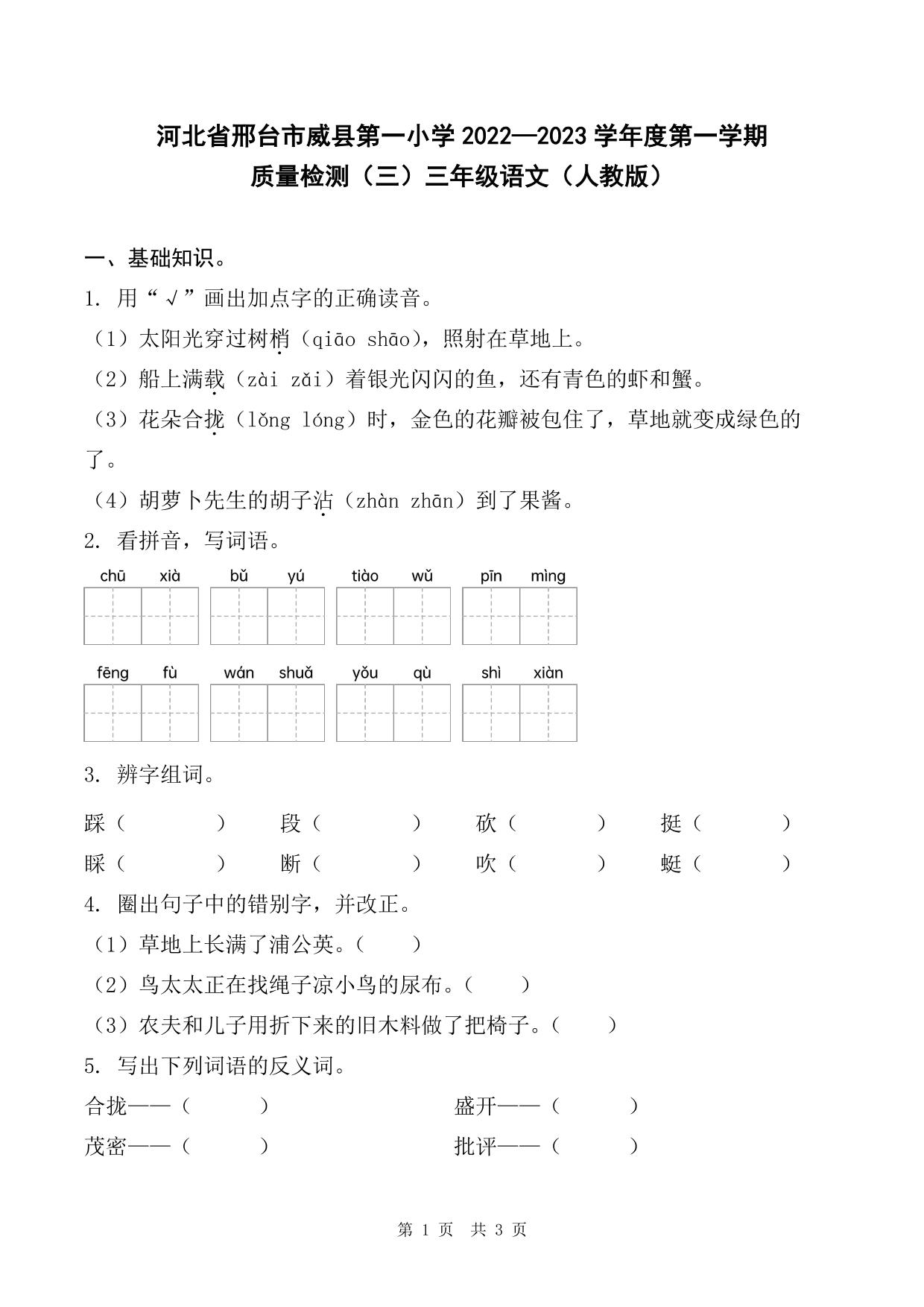 河北省邢台市威县第一小学2022-2023学年度第一学期质量检测(三)三年级语文(人教版)