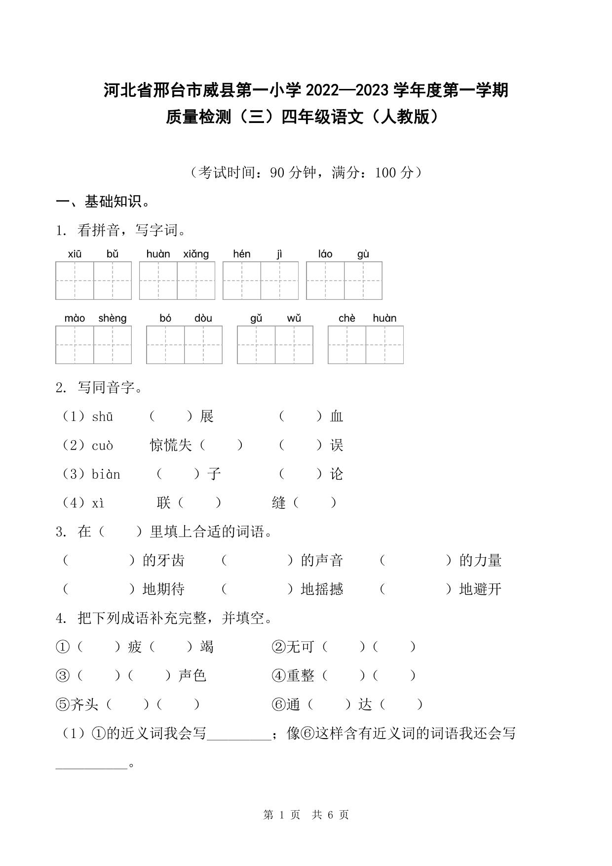 河北省邢台市威县第一小学2022-2023学年度第一学期质量检测(三)四年级语文(人教版)