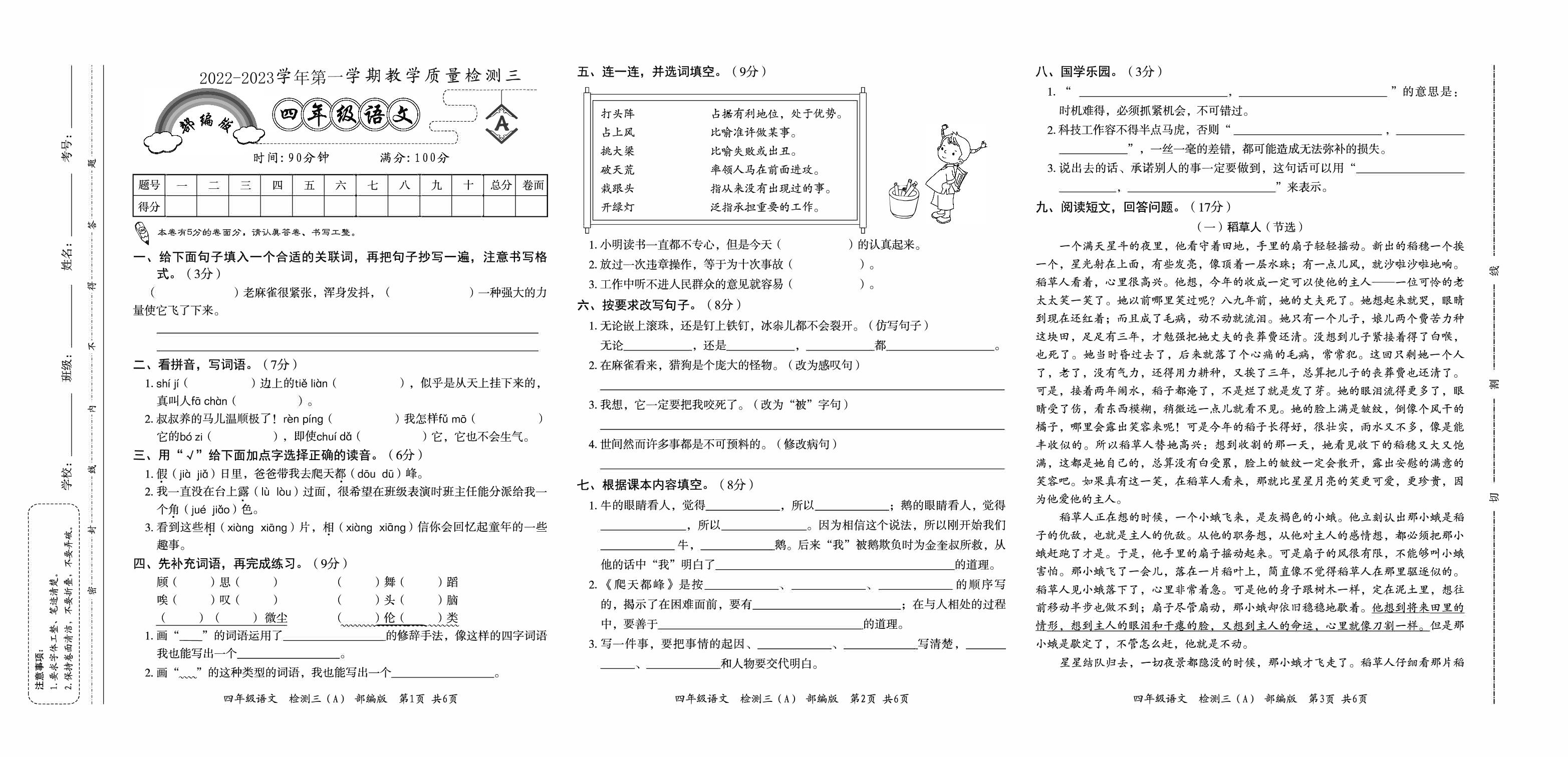 河北省邯郸市广平县明德小学2022-2023学年第一学期教学质量检测(三)四年级语文(人教版)