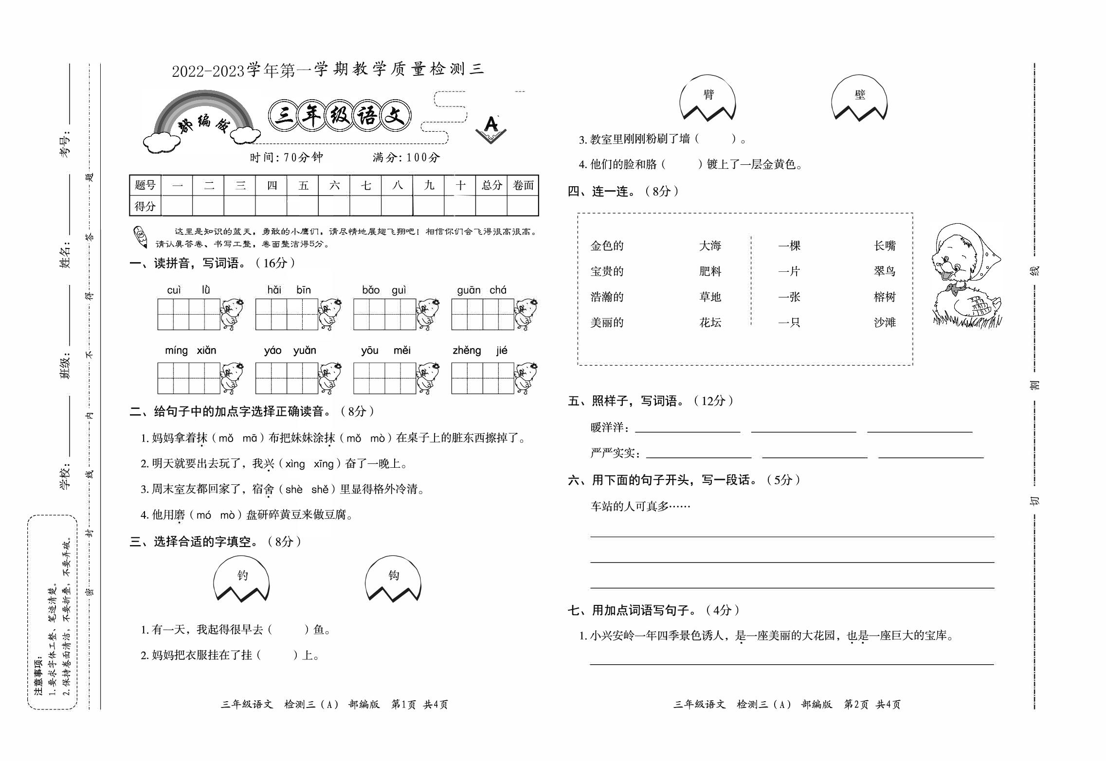 河北省邯郸市广平县明德小学2022-2023学年第一学期教学质量语文检测(三)三年级语文(人教版)