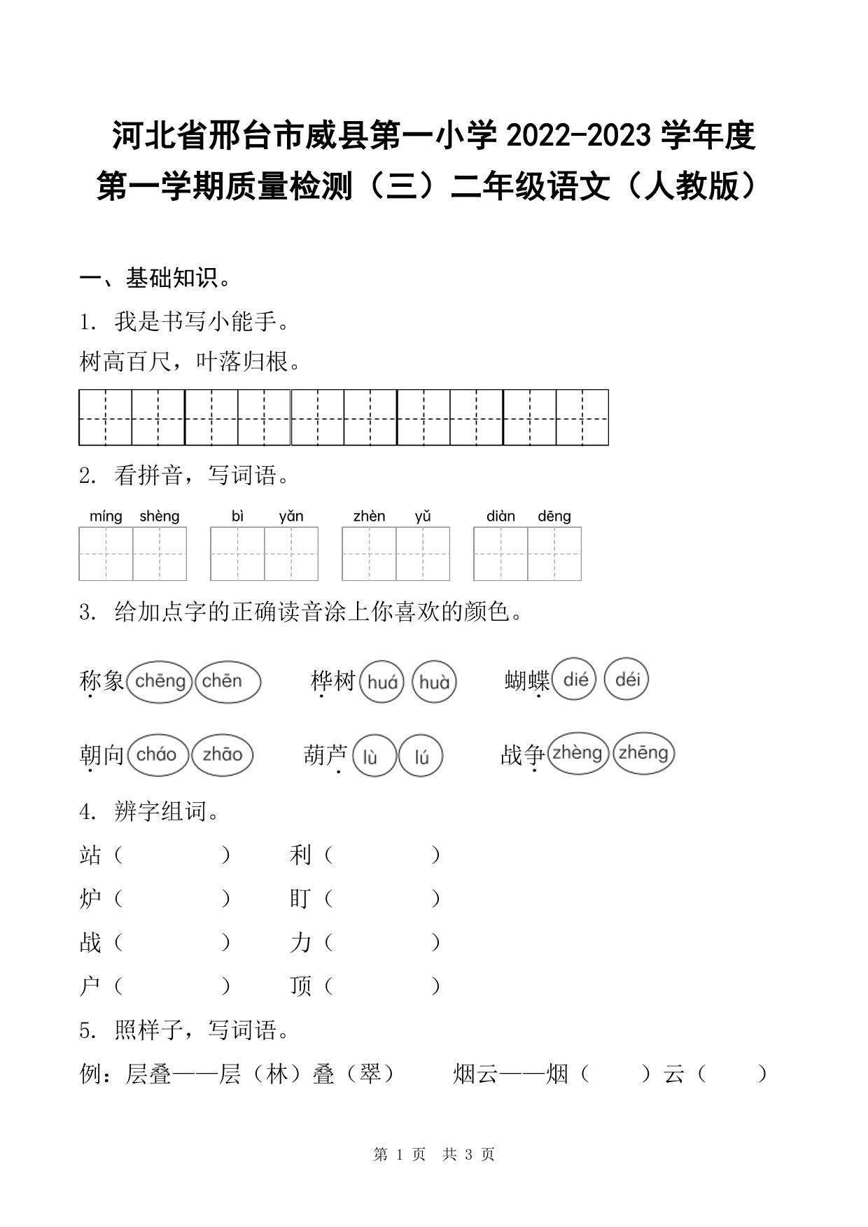 河北省邢台市威县第一小学2022-2023学年度第一学期质量检测(三)二年级语文(人教版)