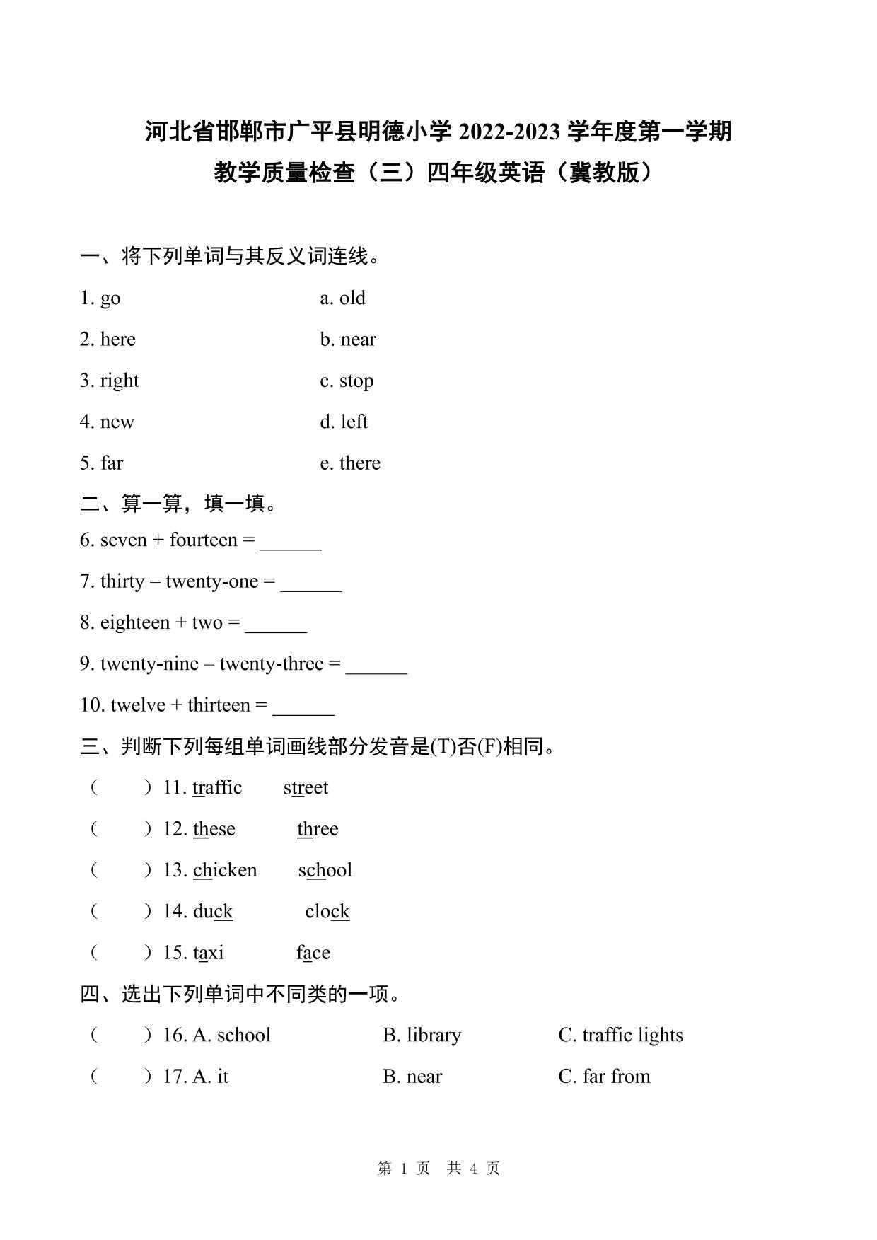 河北省邯郸市广平县明德小学2022-2023学年度第一学期教学质量检测(三)四年级英语(冀教版)【无听力音频】