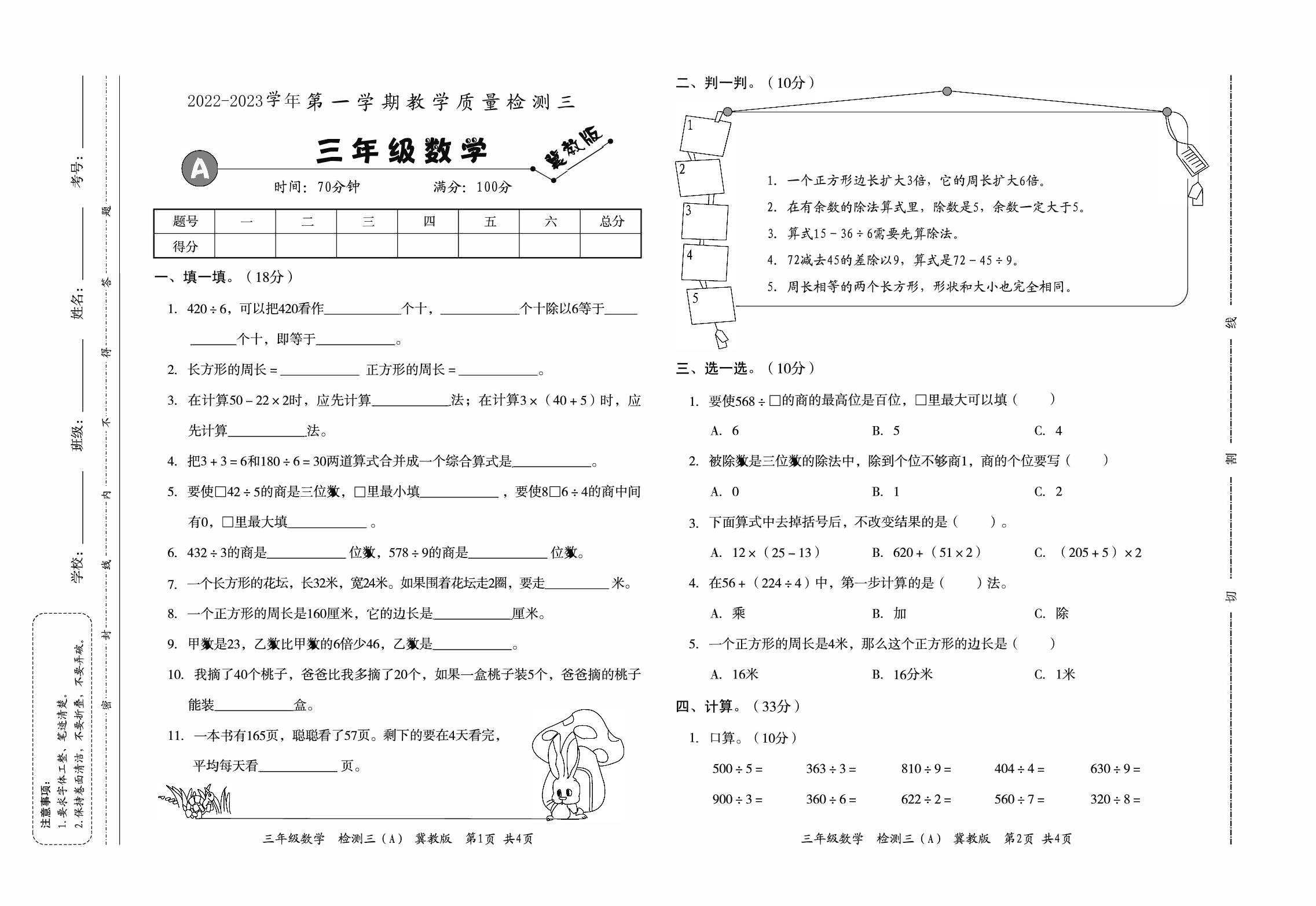 河北省邯郸市广平县明德小学2022-2023学年上学期教学质量检测(三)三年级数学(冀教版)