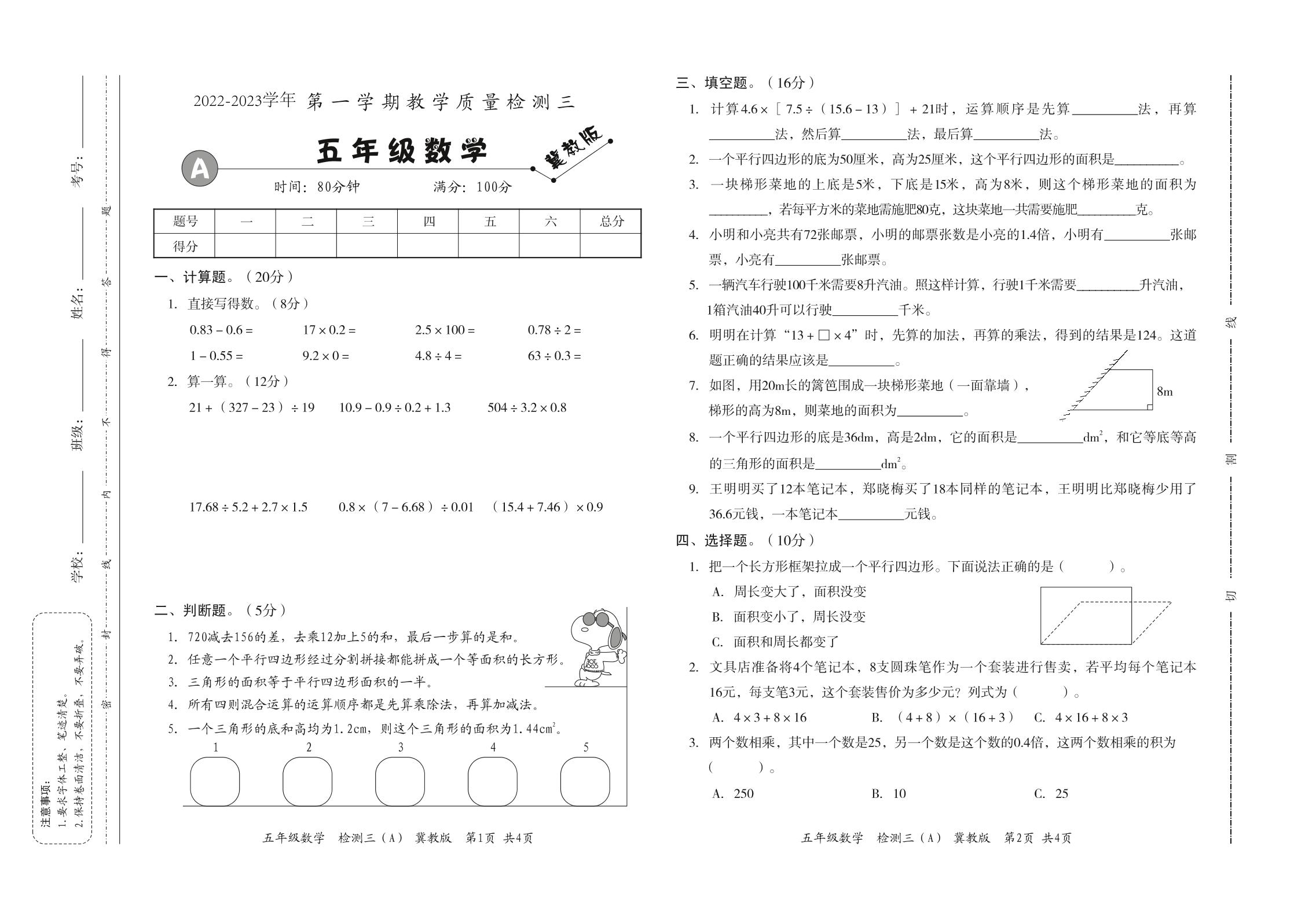 河北省邯郸市广平县明德小学2022-2023学年上学期教学质量检测(三)五年级数学(冀教版)