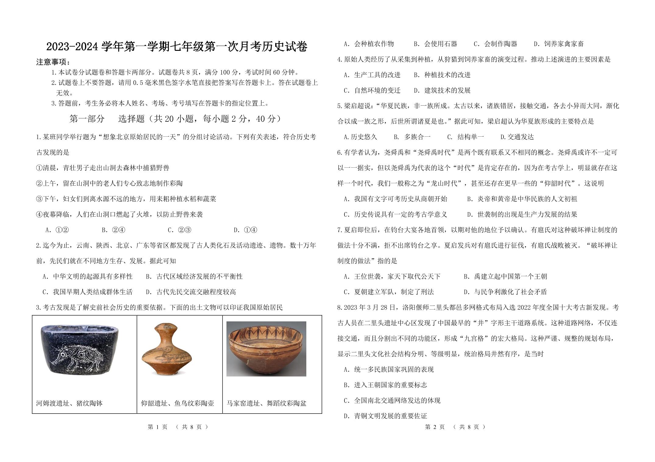 河南省洛阳市东升二中2023—2024学年第一学期第一次月考历史试卷七年级历史(人教版)
