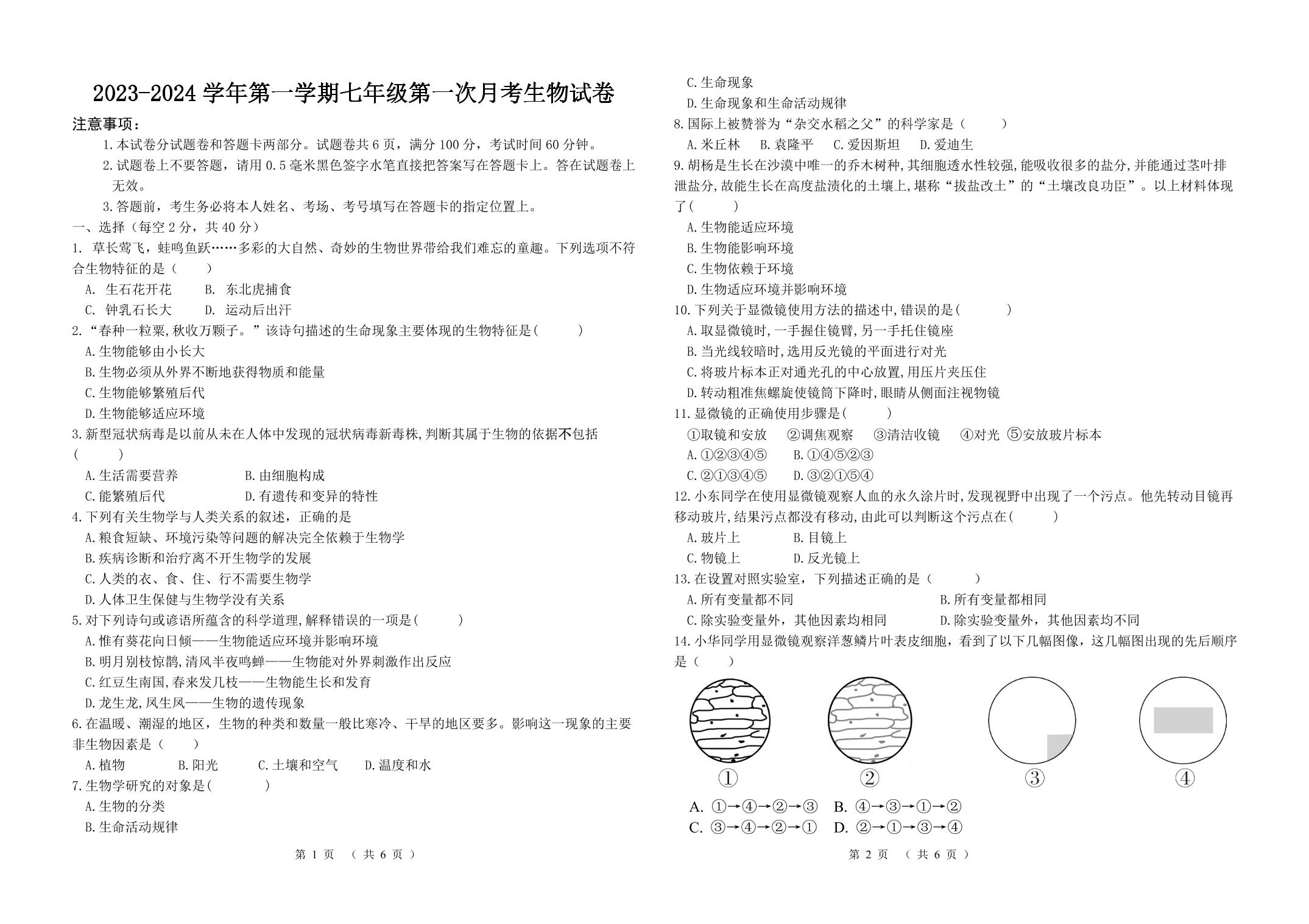 河南省洛阳市东升二中2023—2024学年第一学期第一次月考试卷七年级生物(苏教版)