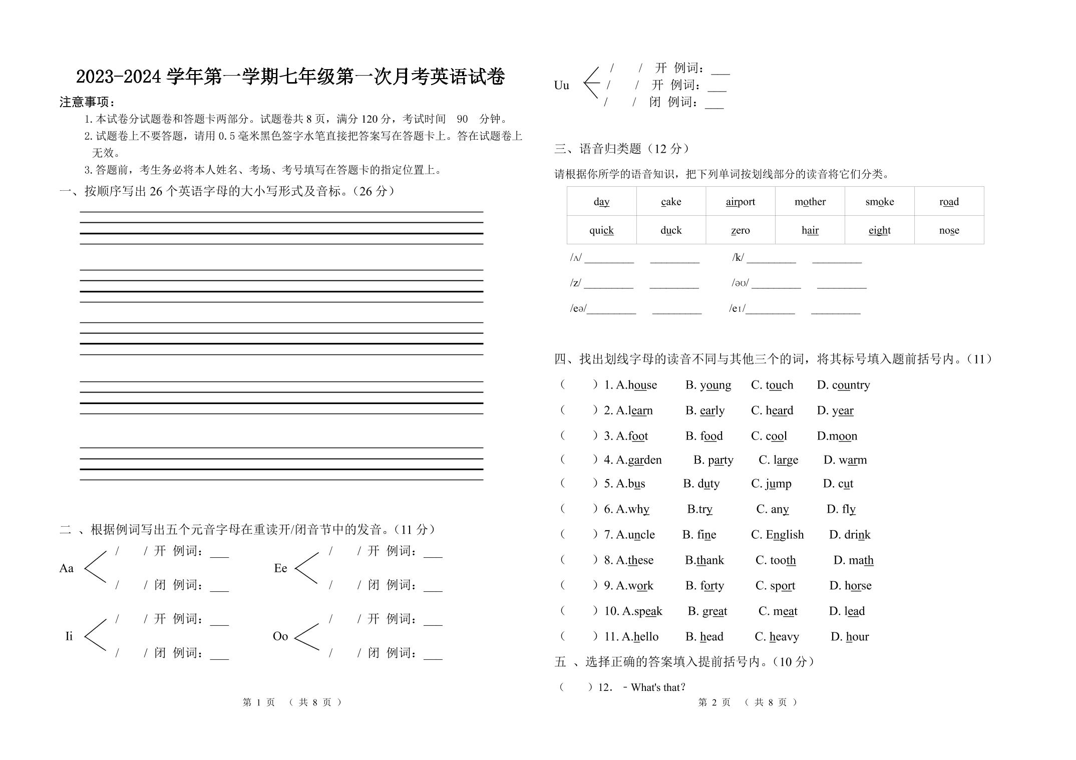 河南省洛阳市东升二中2023-2024学年第一学期第一次月考试卷七年级英语(人教版)【无听力音频】