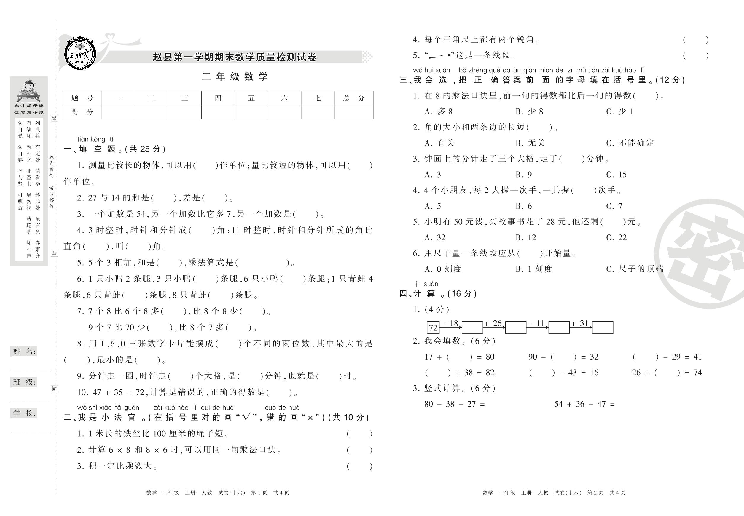 2016-2017学年第一学期石家庄市赵县二年级数学试卷(人教版)【16】