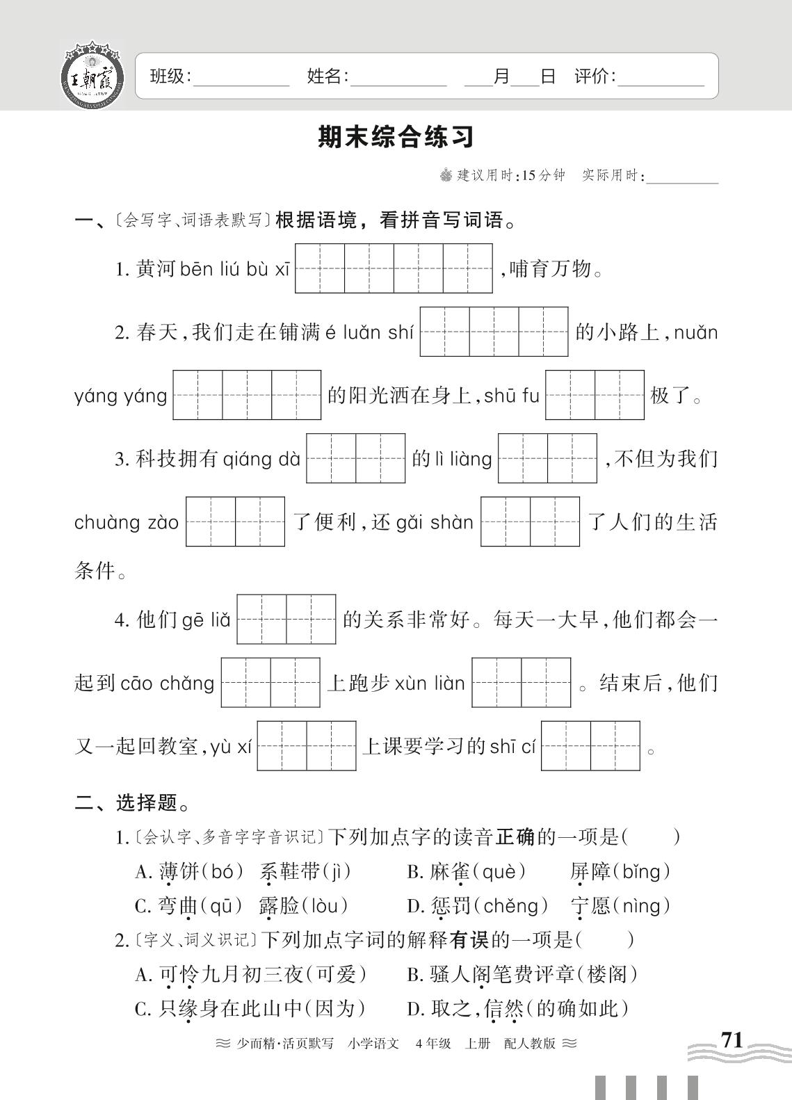 2023上册四年级语文人教版 期末综合练习(默写专练)