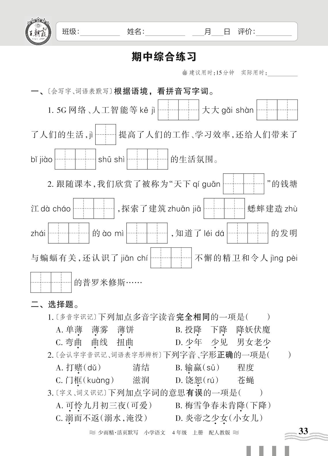 四年级语文人教版上册期中卷