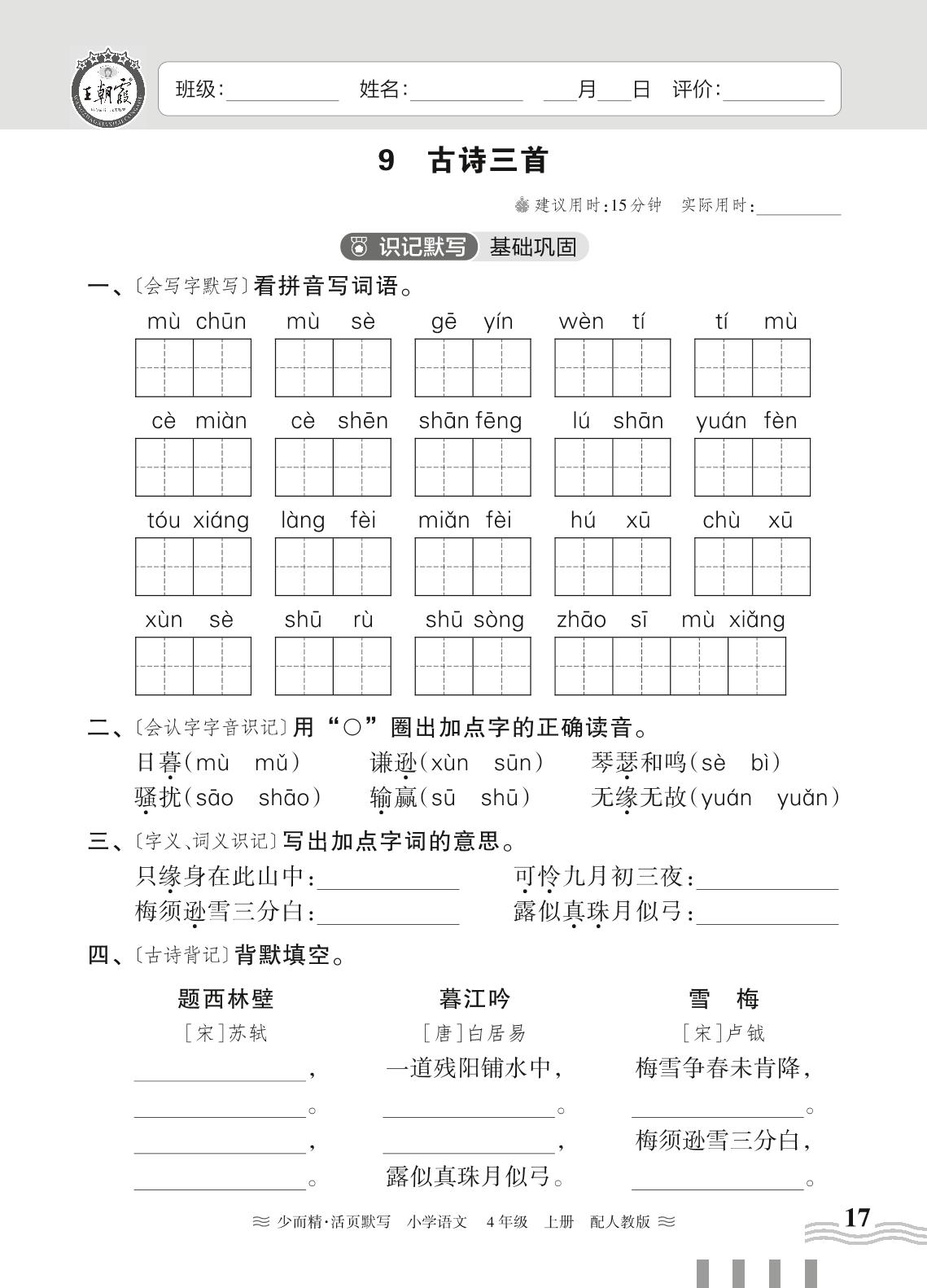 2023上册四年级语文人教版 第三单元——9 古诗三首