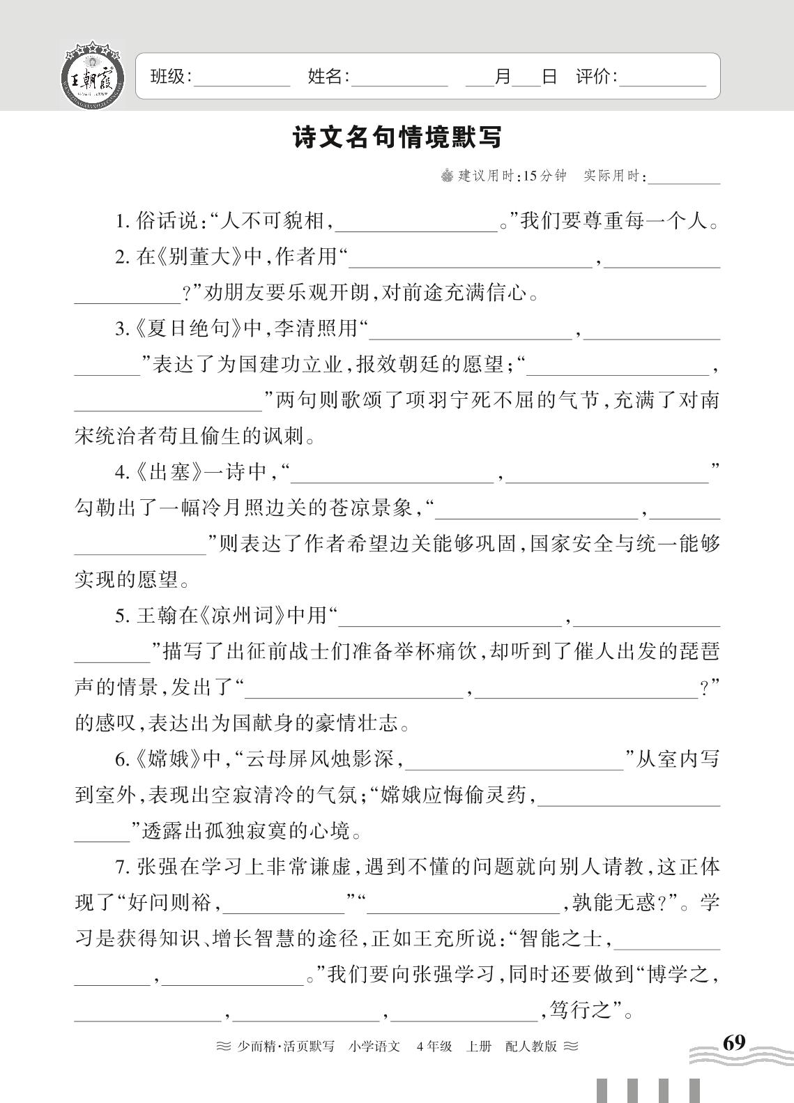 2023上册四年级语文人教版 期末专项练习——诗文名句情境默写