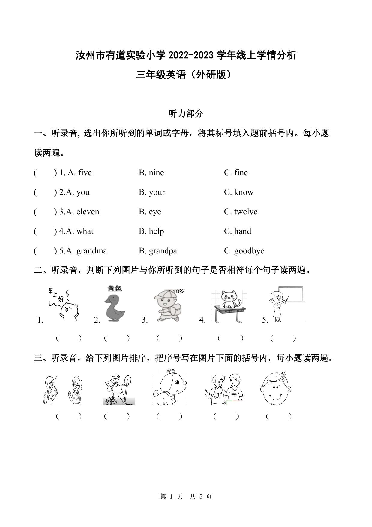 河南省平顶山市汝州市有道实验学校2022-2023学年上学期12月线上学情分析试题三年级英语(外研版)【无听力音频】