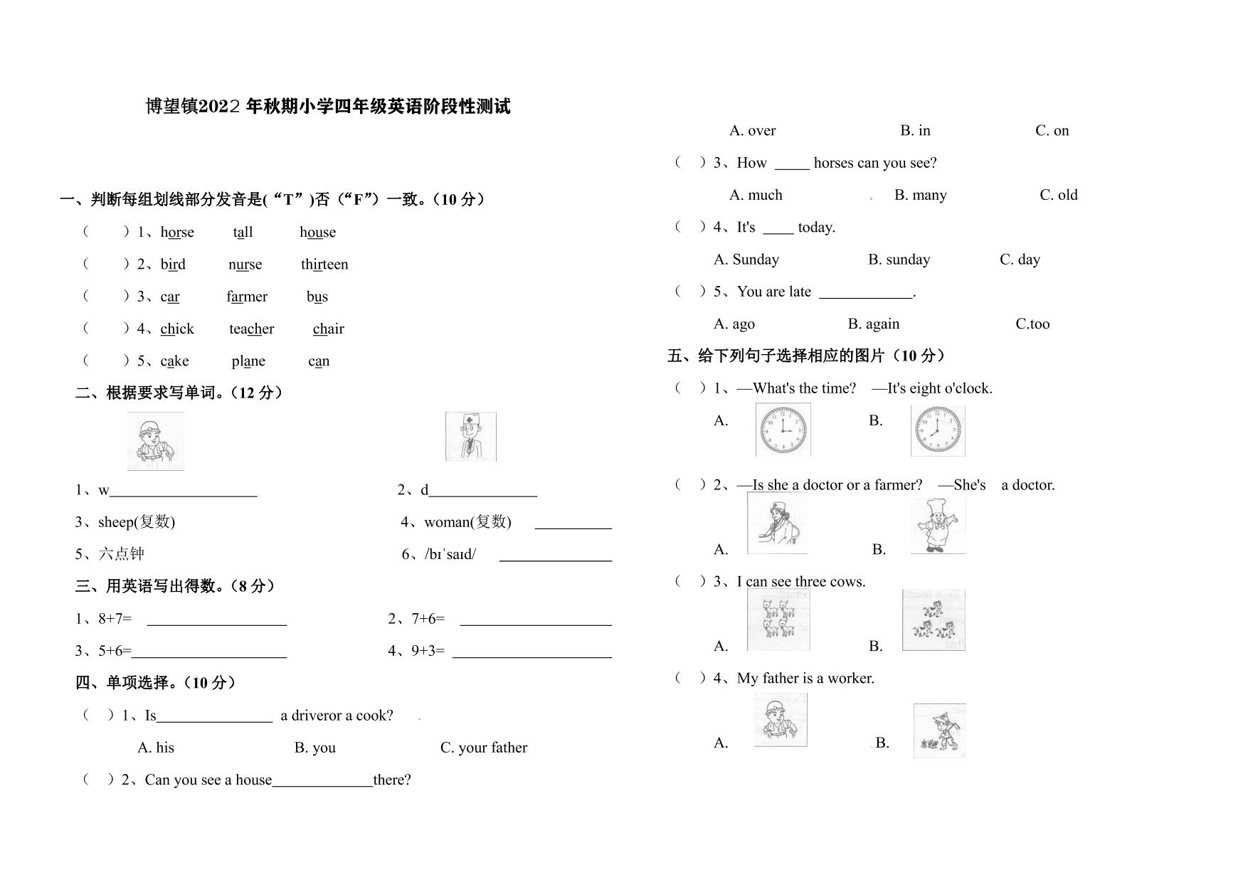 河南省南阳市方城县博望镇中心学校2022年秋期阶段性测试12月月考试题四年级英语(科普版)【无听力音频】