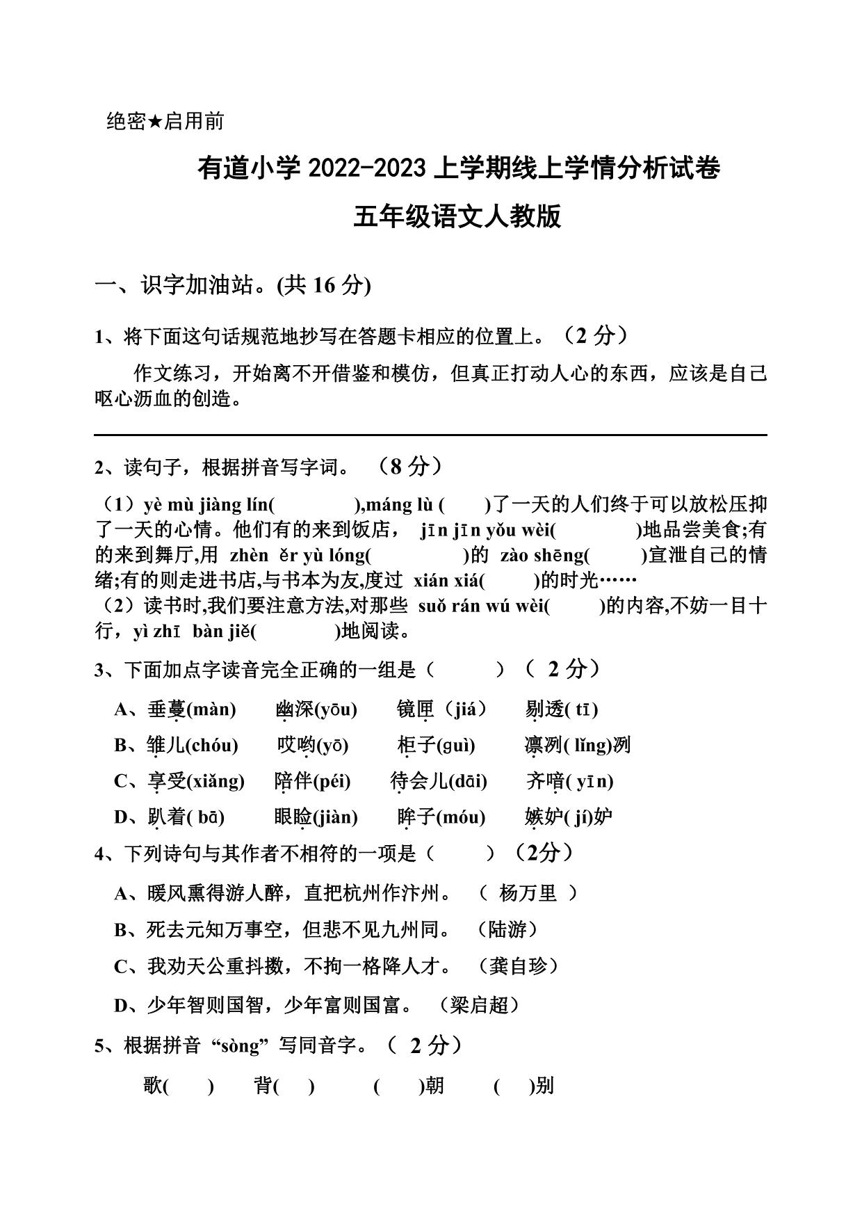 河南省汝州市有道实验学校2022-2023学年上学期12月线上学情分析试题五年级语文(人教版)