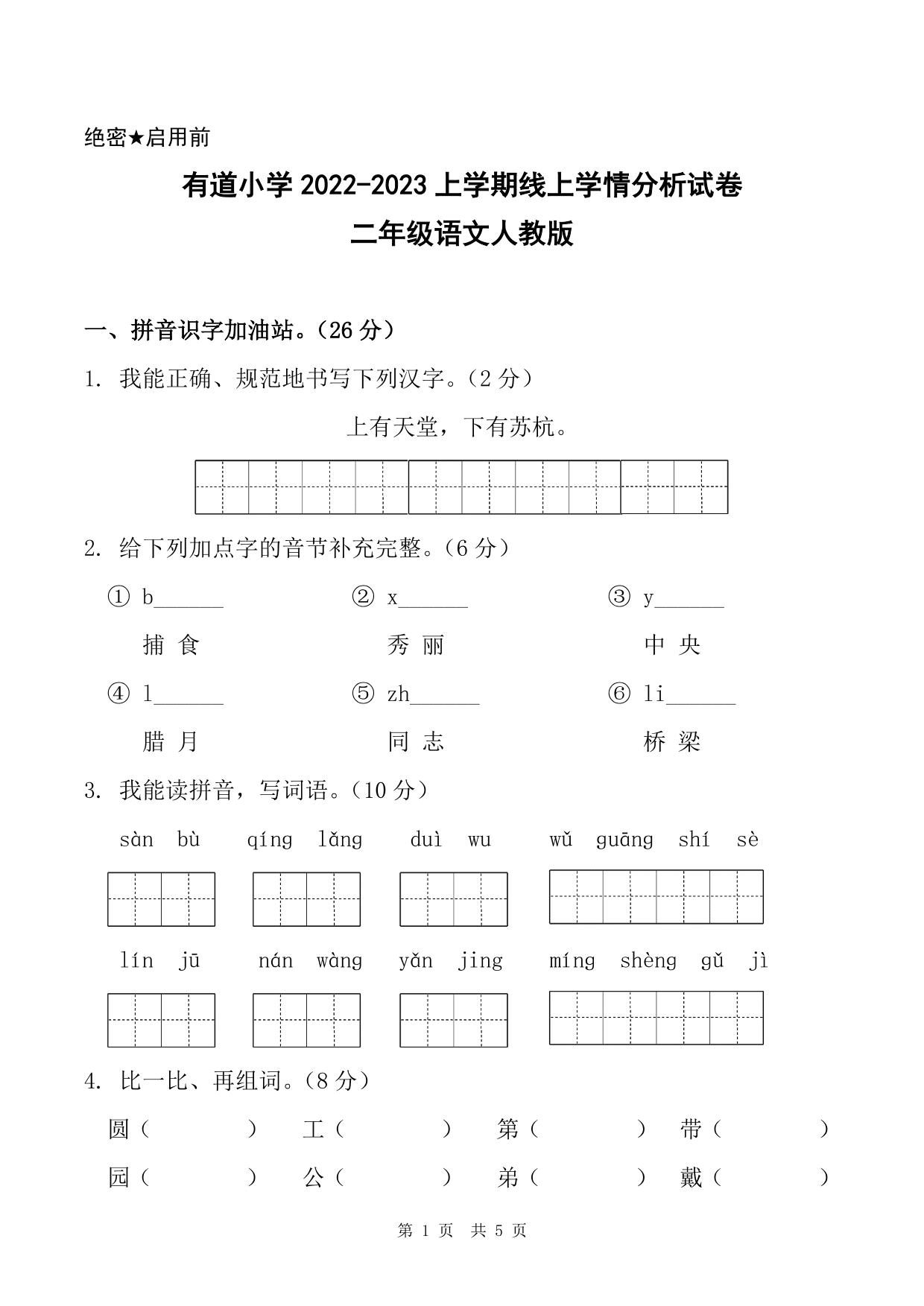 河南省汝州市有道实验学校2022-2023学年上学期12月线上学情分析试题二年级语文(人教版)
