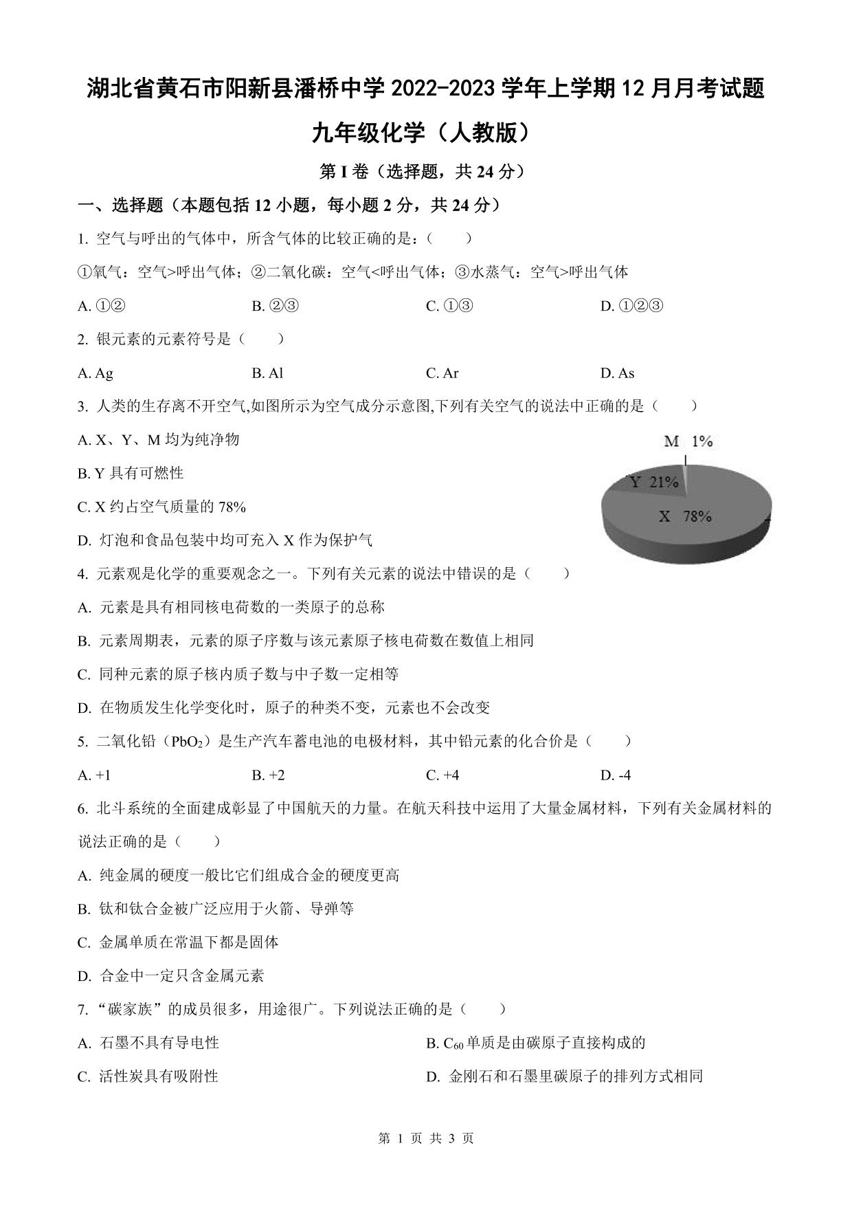 湖北省黄石市阳新县潘桥中学2022-2023学年上学期12月月考试题九年级化学(人教版)