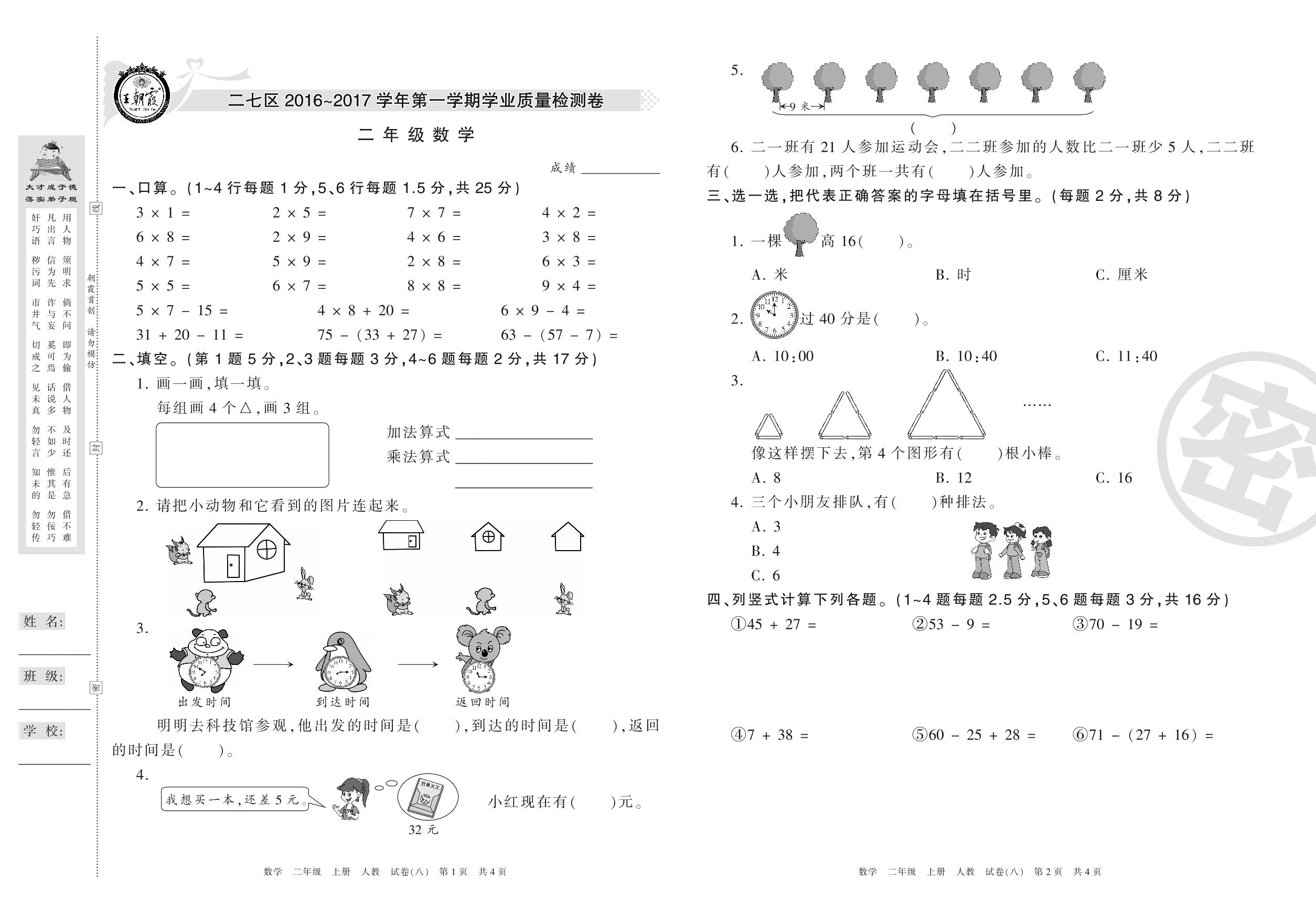 2016-2017学年第一学期郑州市郑汴专版二七区二年级数学试卷(人教版)【8】