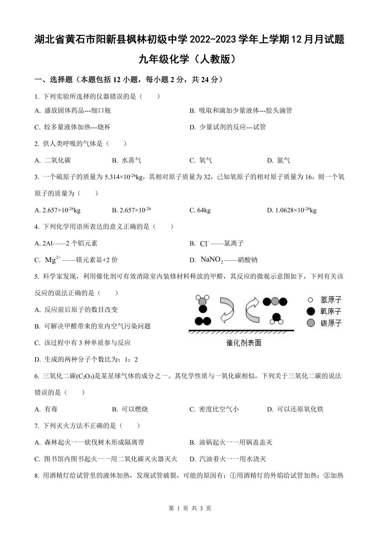 湖北省黄石市阳新县枫林初级中学2022-2023学年上学期12月月考试题九年级化学(人教版)