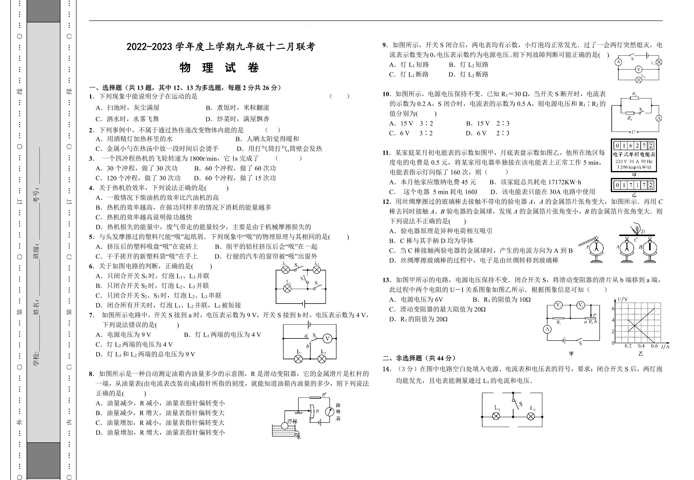 湖北省潜江市2022-2023学年上学期12月月考九年级物理试题(人教版)