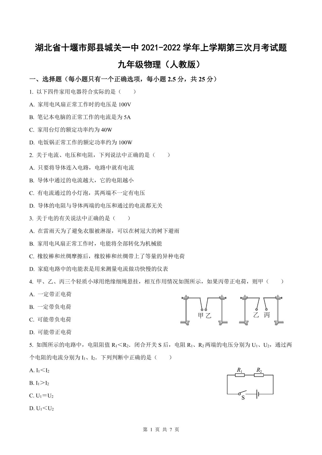 湖北省十堰市郧县城关一中2021-2022学年上学期第三次月考试题九年级物理(人教版)