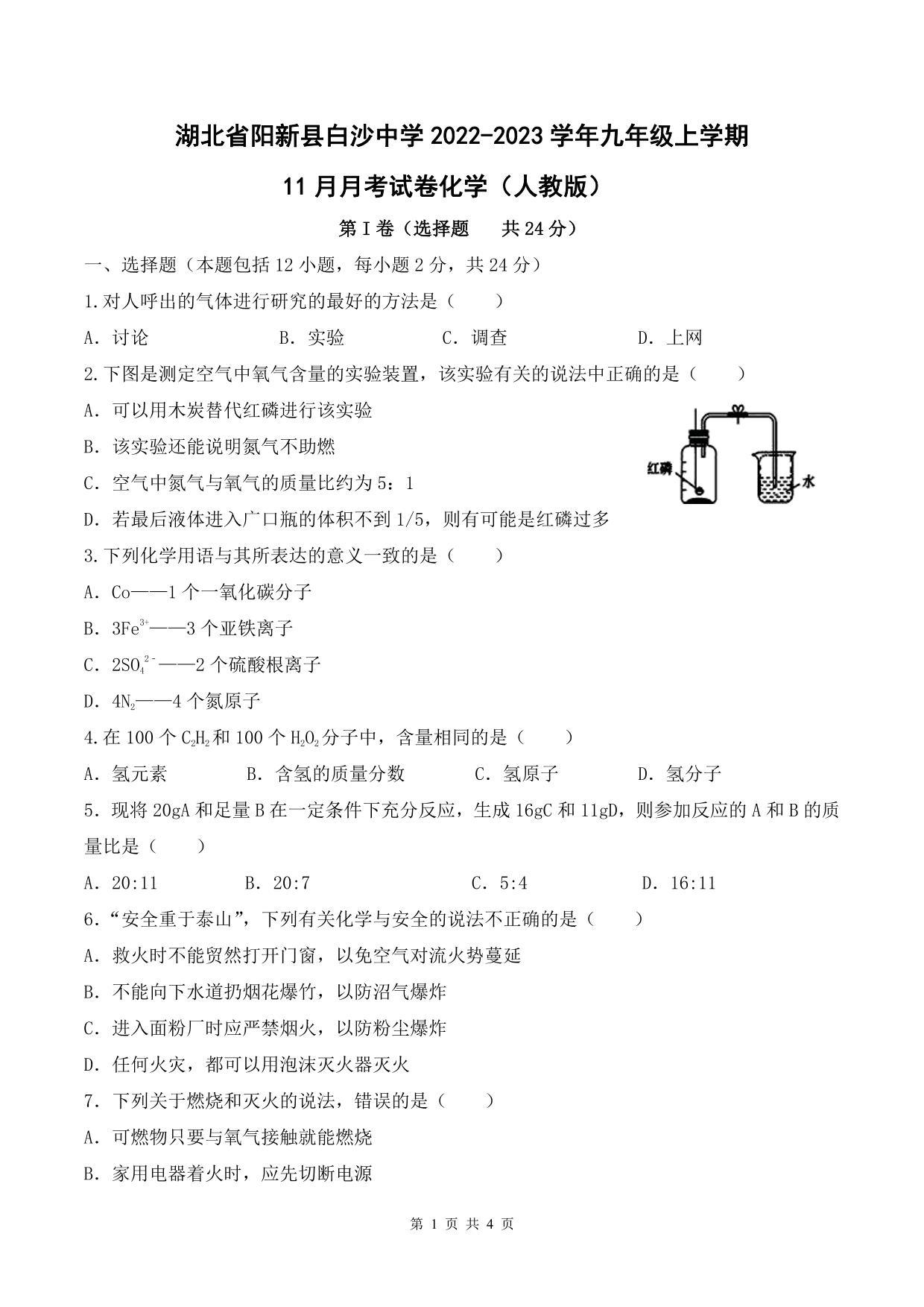 湖北省阳新县白沙中学2022-2023学年上学期11月月考试卷九年级化学(人教版)