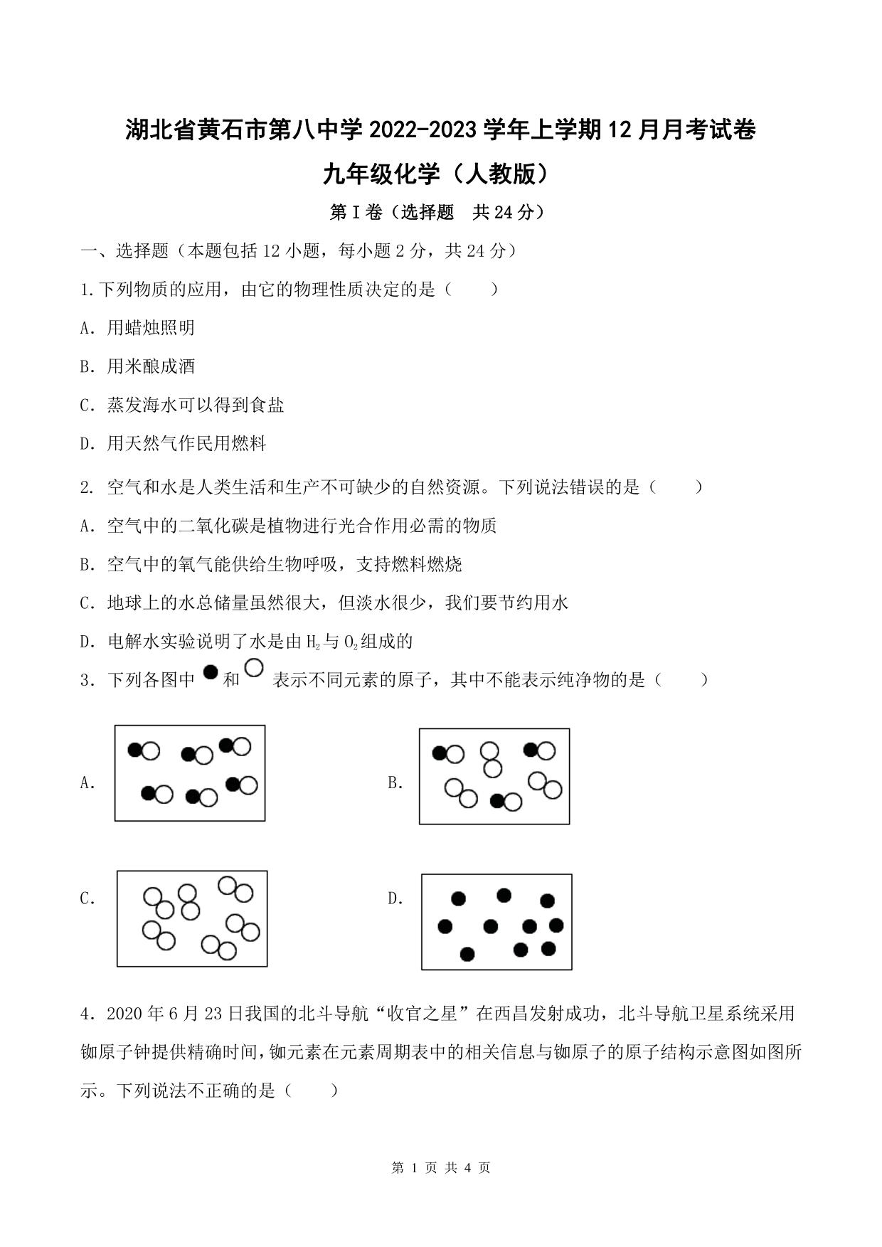 湖北省黄石市第八中学2022-2023学年上学期12月月考试卷九年级化学(人教版)
