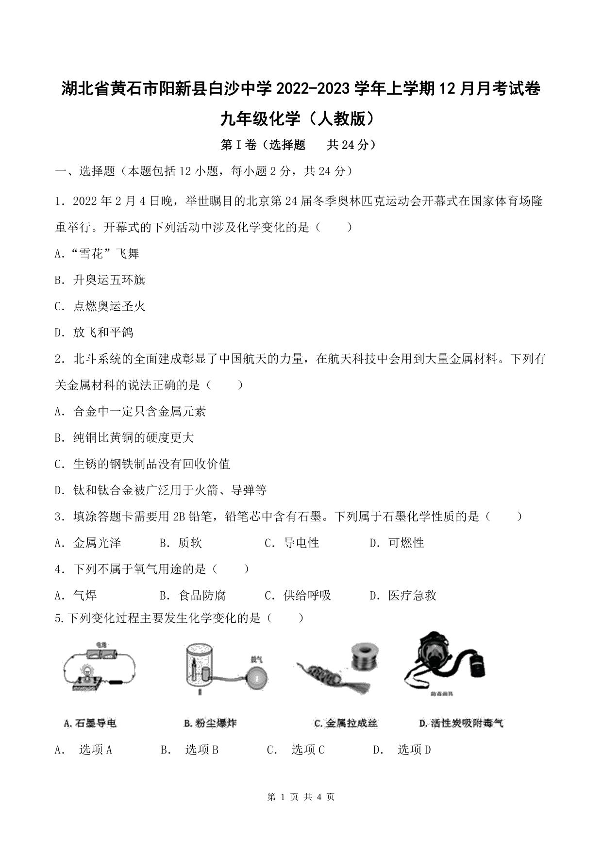 湖北省黄石市阳新县白沙中学2022-2023学年上学期12月份月考试卷九年级化学(人教版)